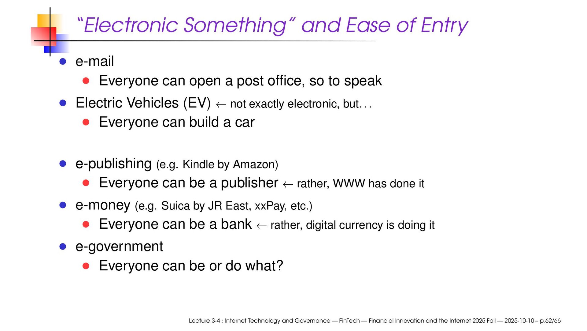 a post office, so to speak Electric Vehicles (EV) ← not exactly electronic, but . . . Everyone can build a car e-publishing (e.g. Kindle by Amazon) Everyone can be a publisher ← rather, WWW has done it e-money (e.g. Suica by JR East, xxPay, etc.) Everyone can be a bank ← rather, digital currency is doing it e-government Everyone can be or do what? Lecture 3-4 : Internet Technology and Governance — FinTech — Financial Innovation and the Internet 2025 Fall — 2025-10-10 – p.62/66