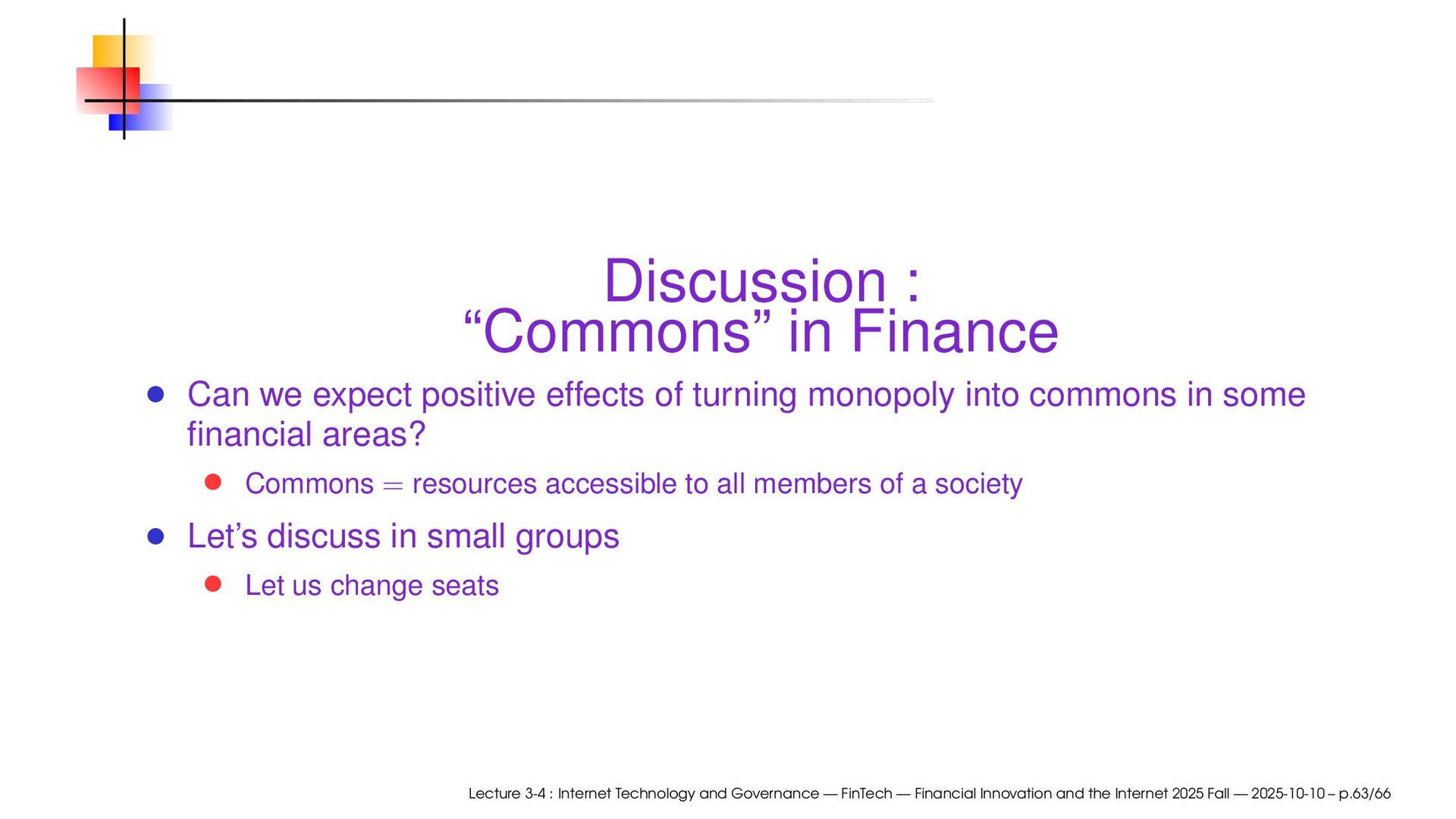 of turning monopoly into commons in some financial areas? Commons = resources accessible to all members of a society Let’s discuss in small groups Let us change seats Lecture 3-4 : Internet Technology and Governance — FinTech — Financial Innovation and the Internet 2025 Fall — 2025-10-10 – p.63/66