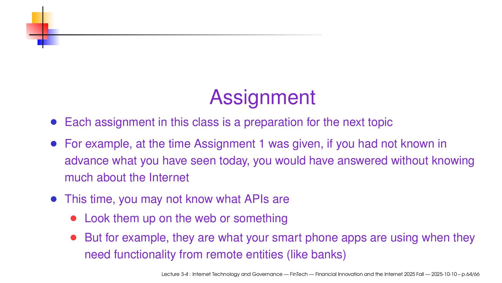 the next topic For example, at the time Assignment 1 was given, if you had not known in advance what you have seen today, you would have answered without knowing much about the Internet This time, you may not know what APIs are Look them up on the web or something But for example, they are what your smart phone apps are using when they need functionality from remote entities (like banks) Lecture 3-4 : Internet Technology and Governance — FinTech — Financial Innovation and the Internet 2025 Fall — 2025-10-10 – p.64/66