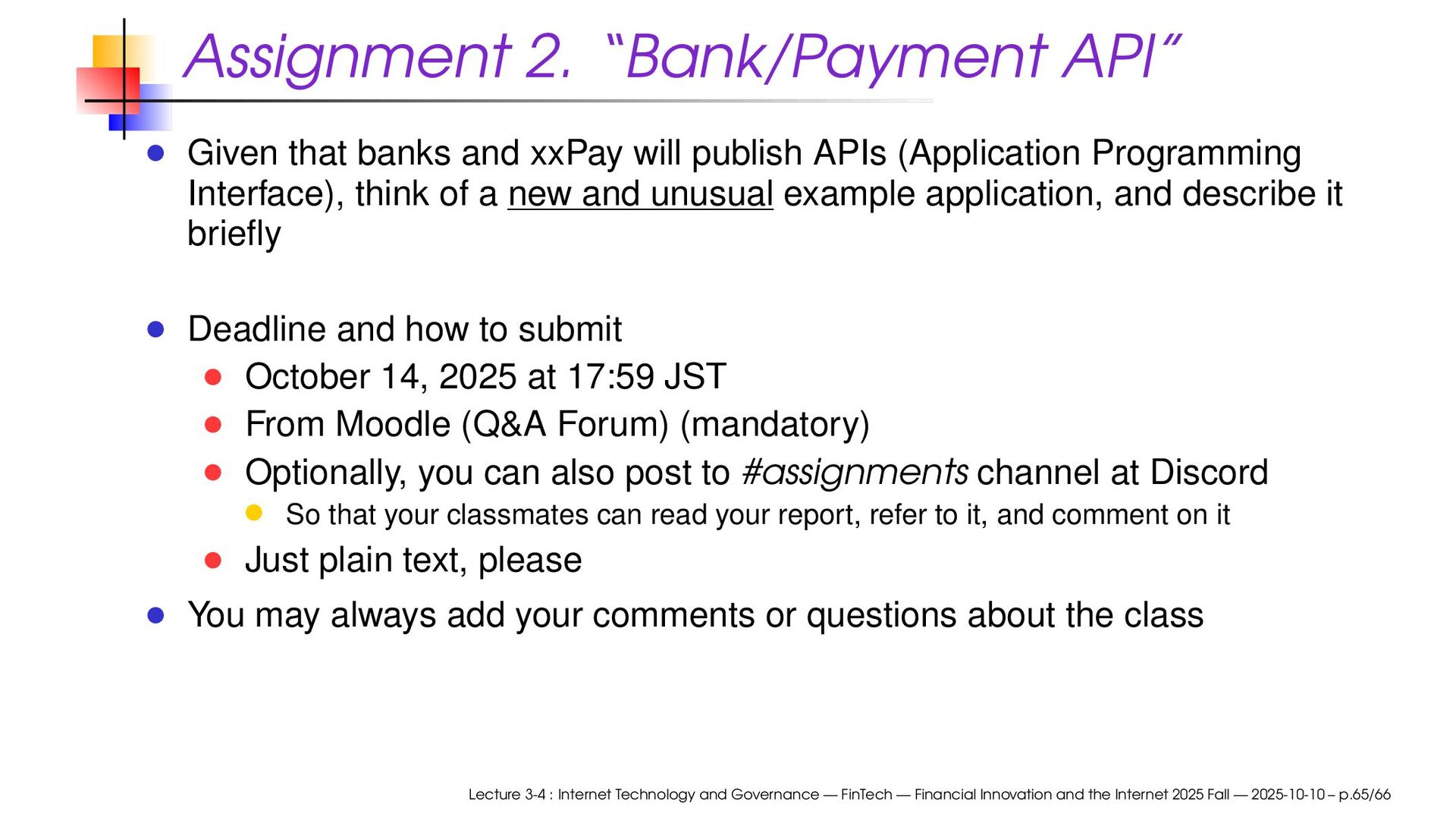 publish APIs (Application Programming Interface), think of a new and unusual example application, and describe it briefly Deadline and how to submit October 14, 2025 at 17:59 JST From Moodle (Q&A Forum) (mandatory) Optionally, you can also post to #assignments channel at Discord So that your classmates can read your report, refer to it, and comment on it Just plain text, please You may always add your comments or questions about the class Lecture 3-4 : Internet Technology and Governance — FinTech — Financial Innovation and the Internet 2025 Fall — 2025-10-10 – p.65/66