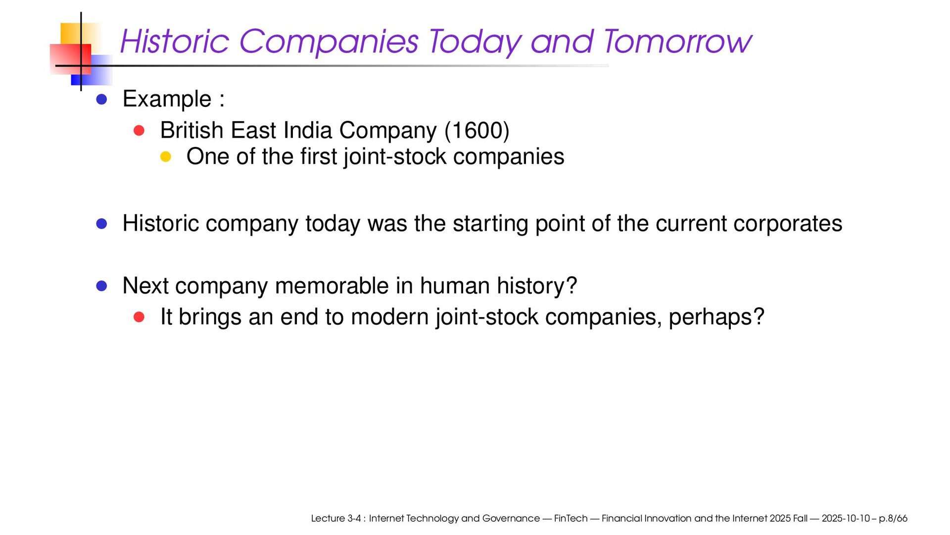 Company (1600) One of the first joint-stock companies Historic company today was the starting point of the current corporates Next company memorable in human history? It brings an end to modern joint-stock companies, perhaps? Lecture 3-4 : Internet Technology and Governance — FinTech — Financial Innovation and the Internet 2025 Fall — 2025-10-10 – p.8/66
