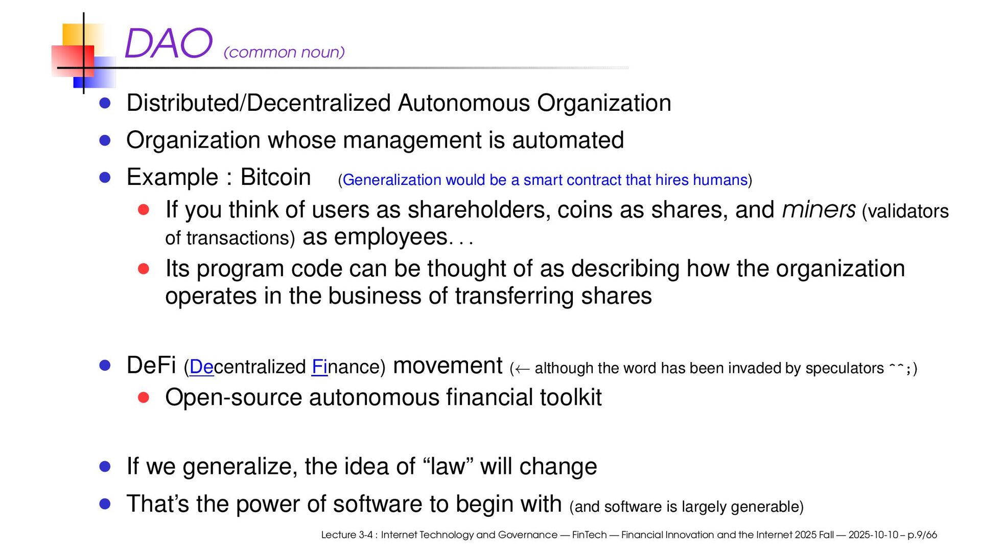 automated Example : Bitcoin (Generalization would be a smart contract that hires humans) If you think of users as shareholders, coins as shares, and miners (validators of transactions) as employees . . . Its program code can be thought of as describing how the organization operates in the business of transferring shares DeFi (Decentralized Finance) movement (← although the word has been invaded by speculators ^^;) Open-source autonomous financial toolkit If we generalize, the idea of “law” will change That’s the power of software to begin with (and software is largely generable) Lecture 3-4 : Internet Technology and Governance — FinTech — Financial Innovation and the Internet 2025 Fall — 2025-10-10 – p.9/66