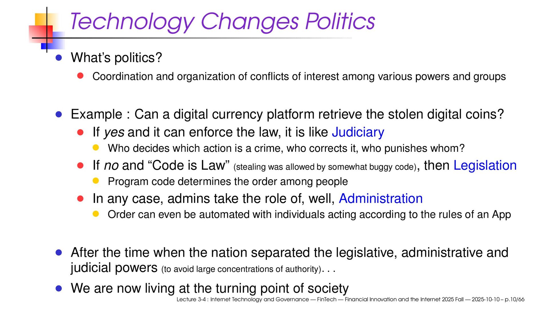 of interest among various powers and groups Example : Can a digital currency platform retrieve the stolen digital coins? If yes and it can enforce the law, it is like Judiciary Who decides which action is a crime, who corrects it, who punishes whom? If no and “Code is Law” (stealing was allowed by somewhat buggy code), then Legislation Program code determines the order among people In any case, admins take the role of, well, Administration Order can even be automated with individuals acting according to the rules of an App After the time when the nation separated the legislative, administrative and judicial powers (to avoid large concentrations of authority) . . . We are now living at the turning point of society Lecture 3-4 : Internet Technology and Governance — FinTech — Financial Innovation and the Internet 2025 Fall — 2025-10-10 – p.10/66