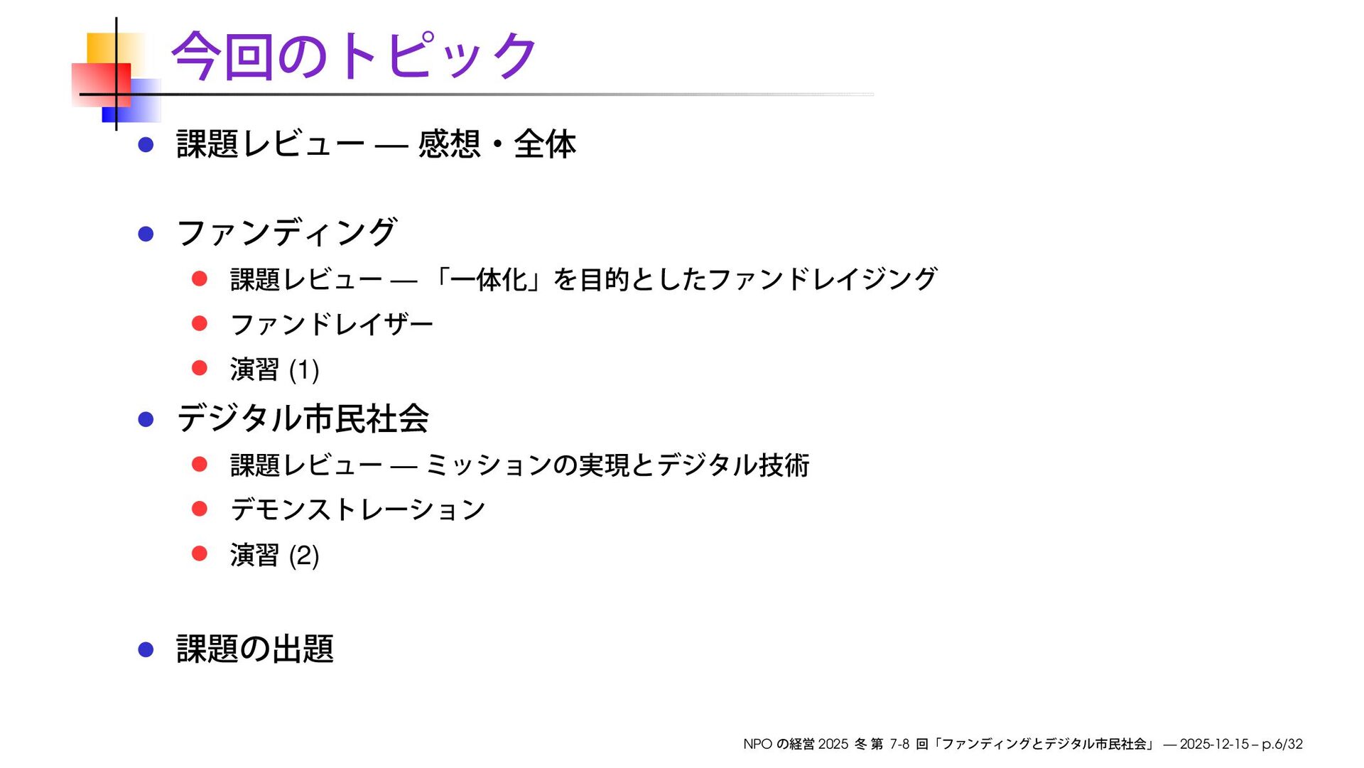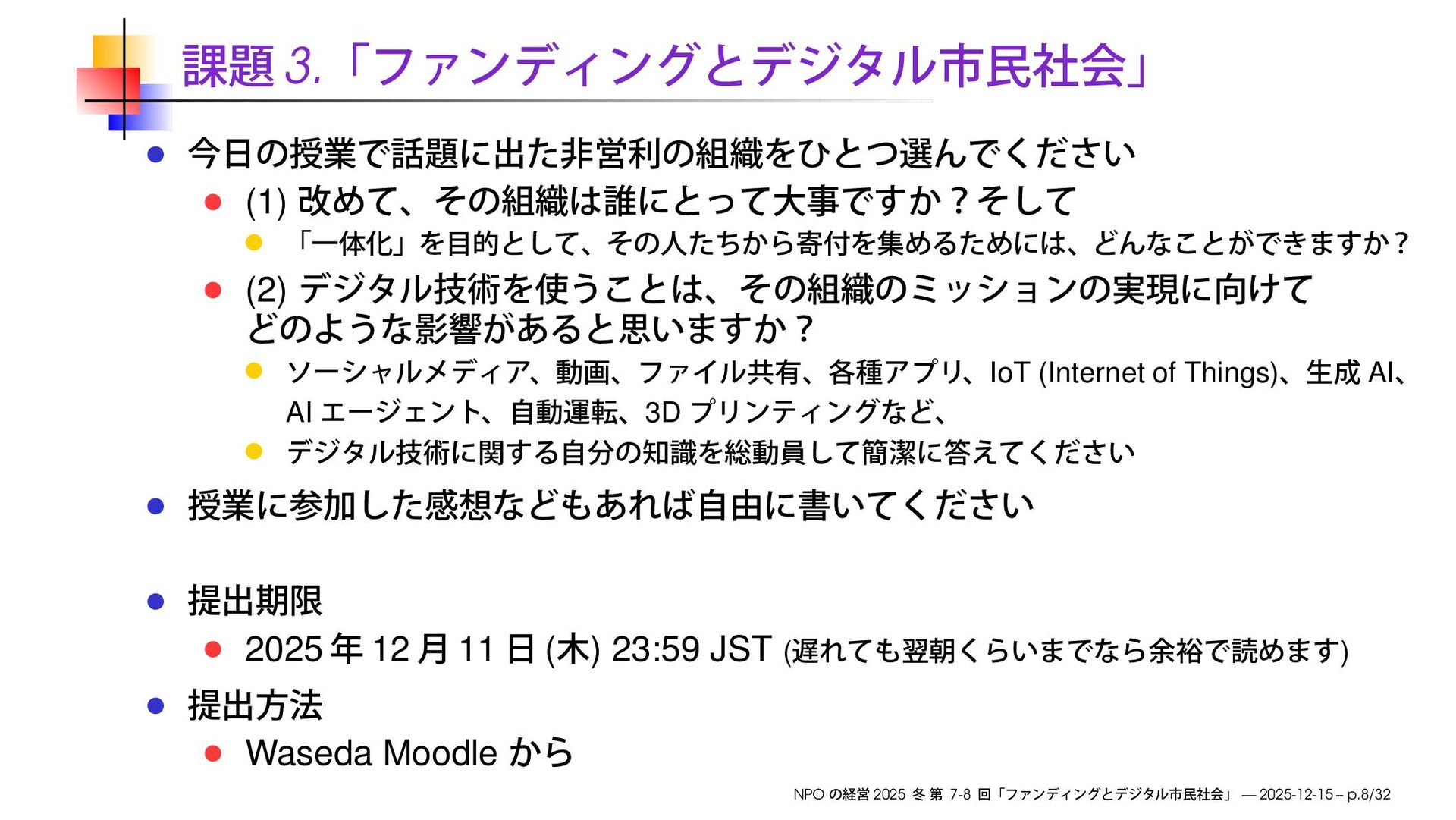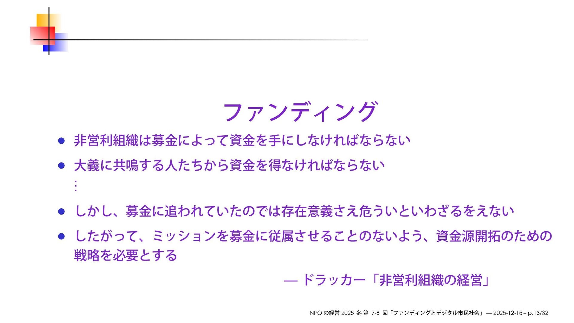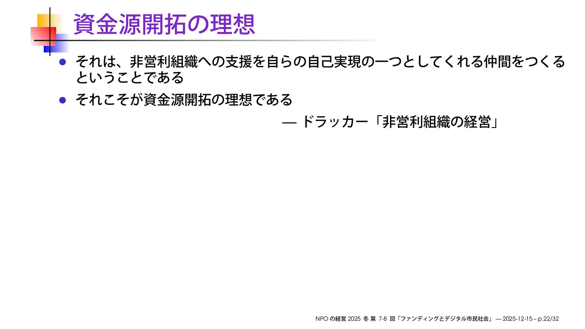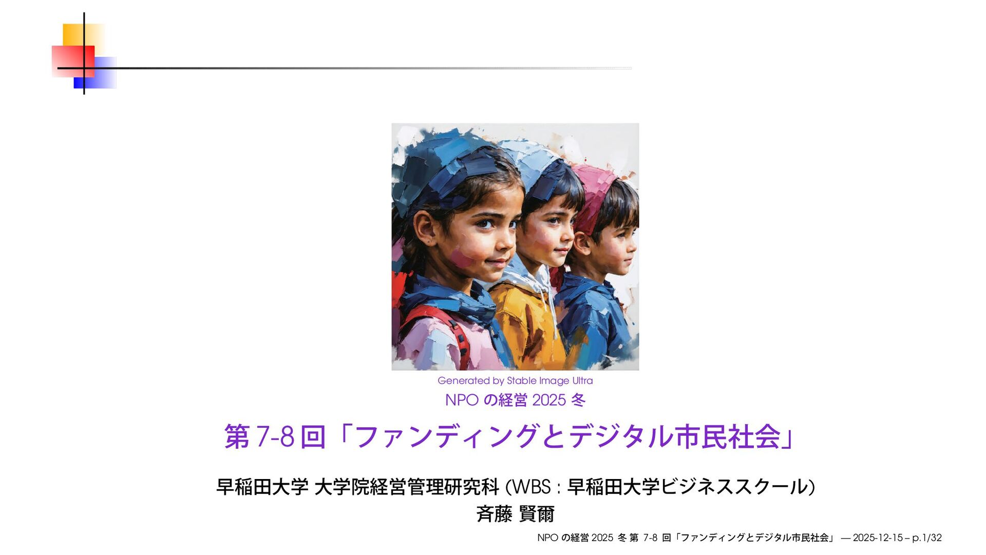 早稲田大学大学院経営管理研究科「NPO の経営」2025 冬の第7-8回で使用したスライドです。