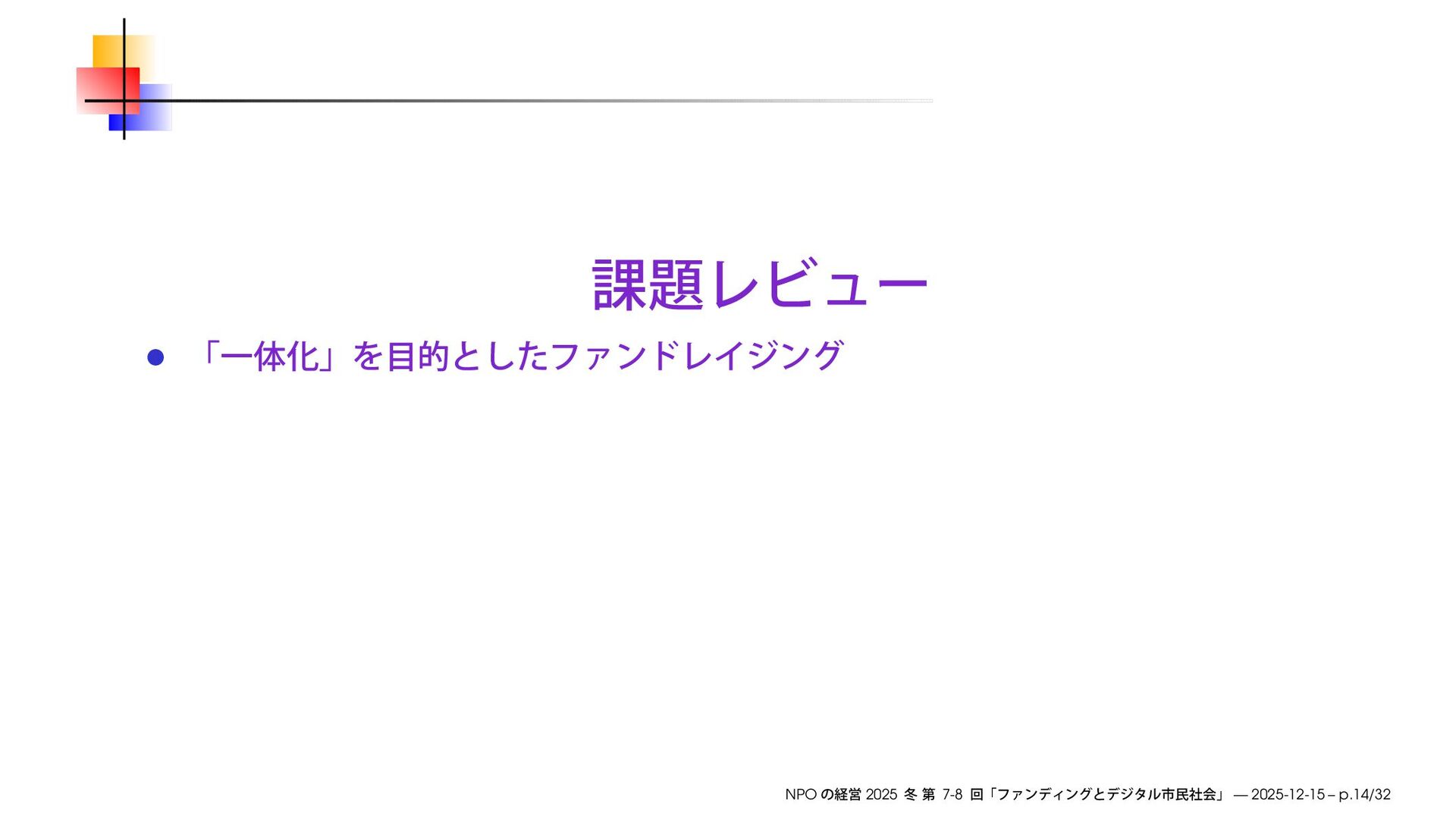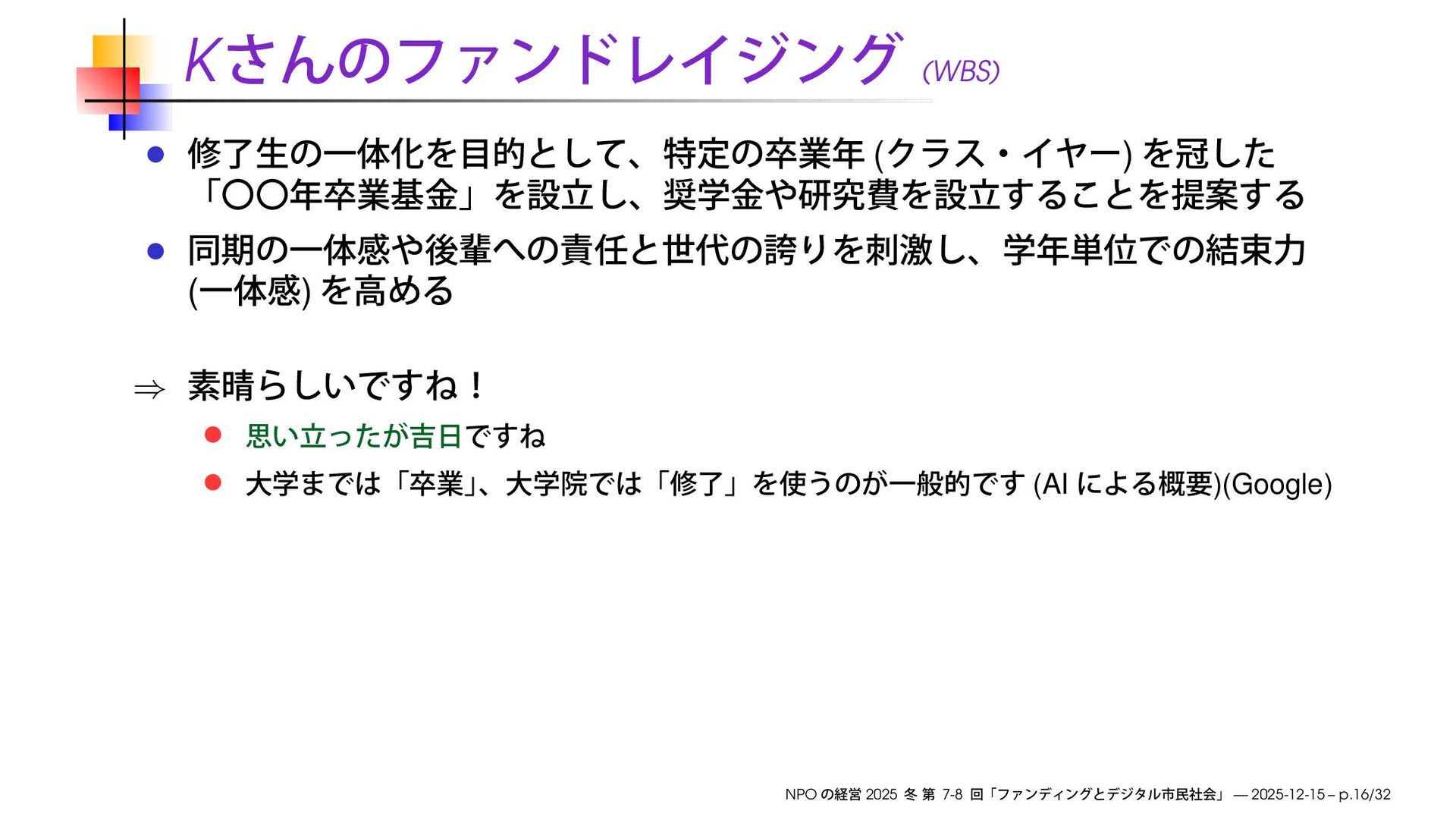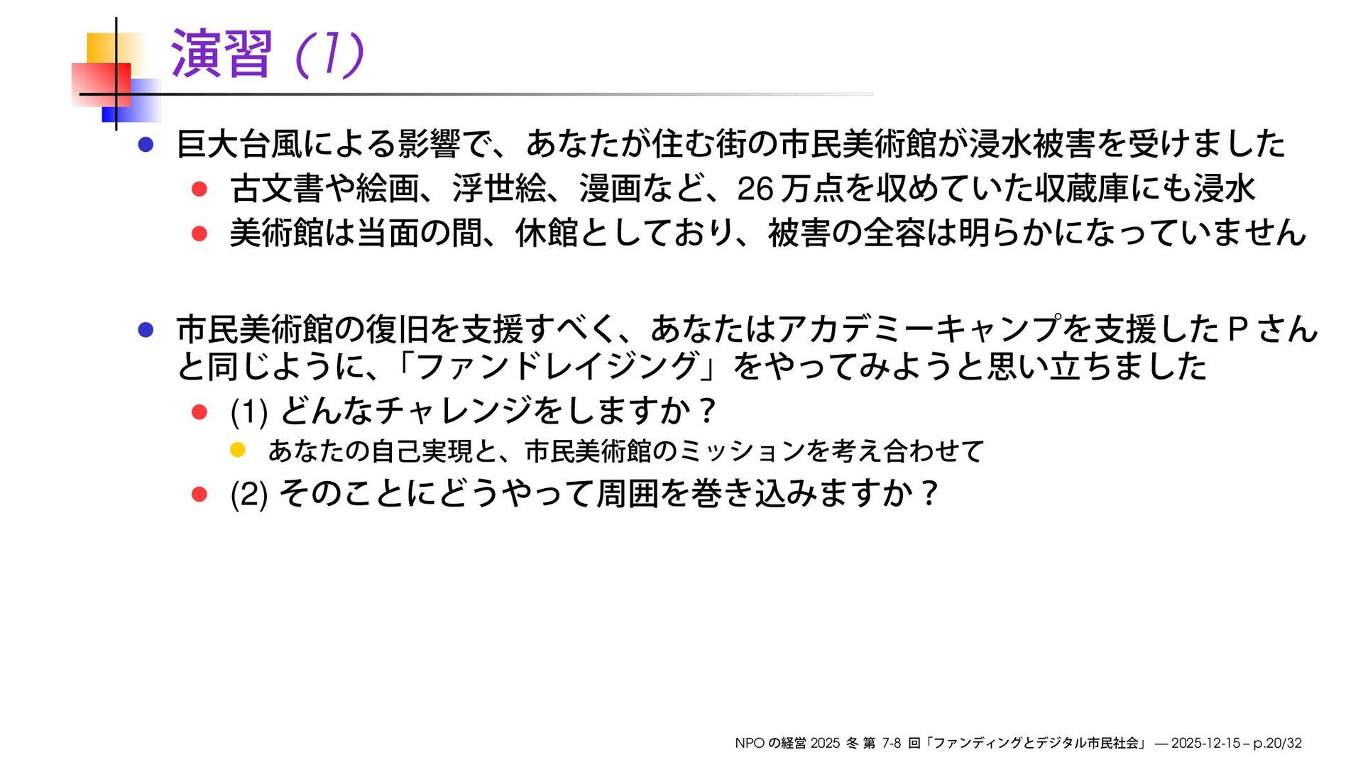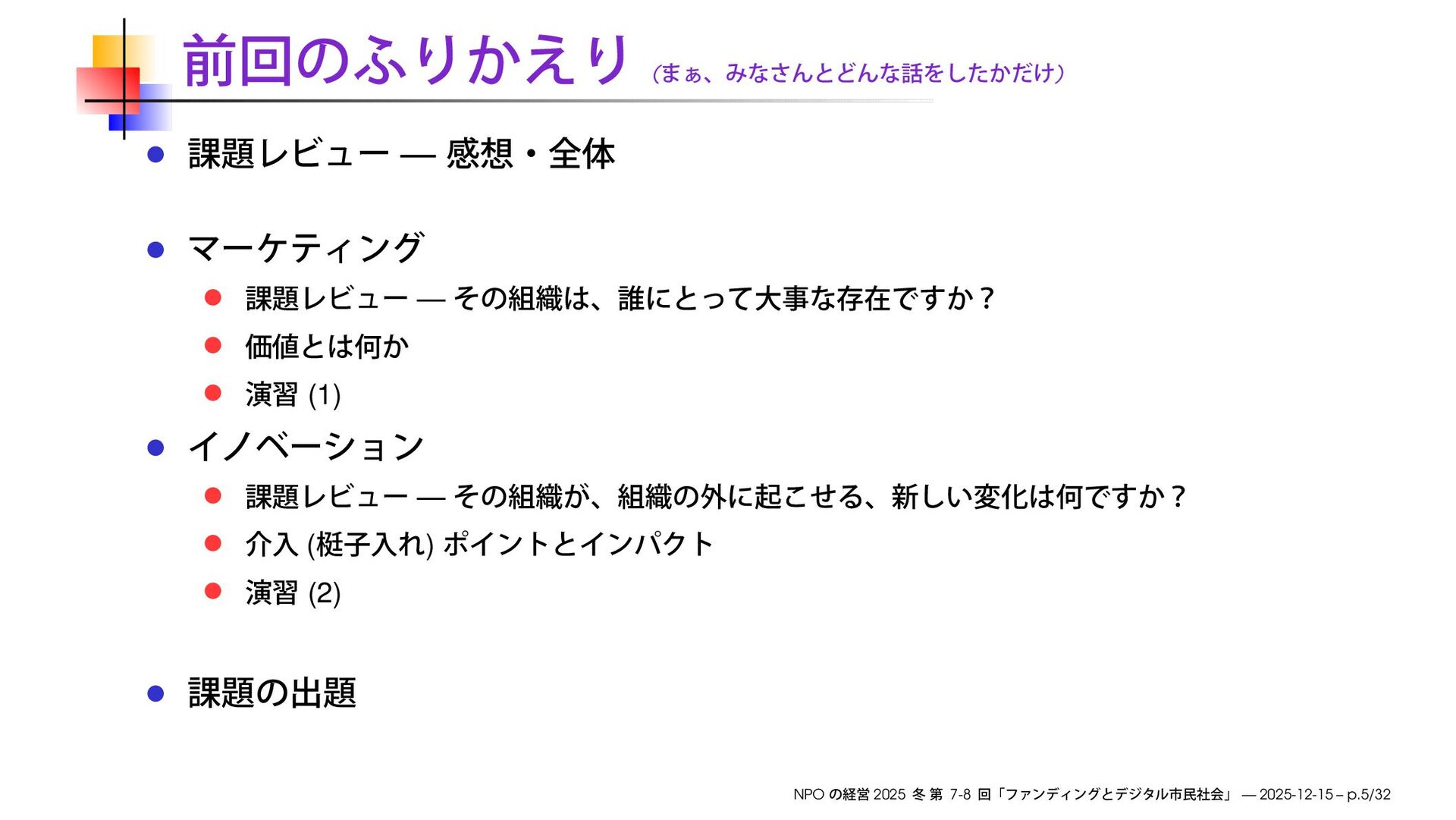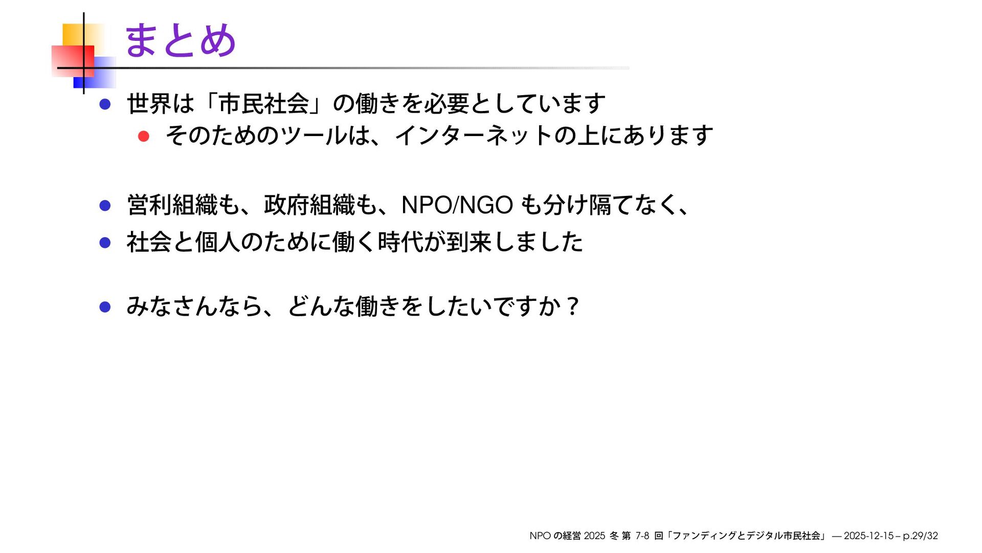 早稲田大学大学院経営管理研究科「NPO の経営」2025 冬の第7-8回で使用したスライドです。