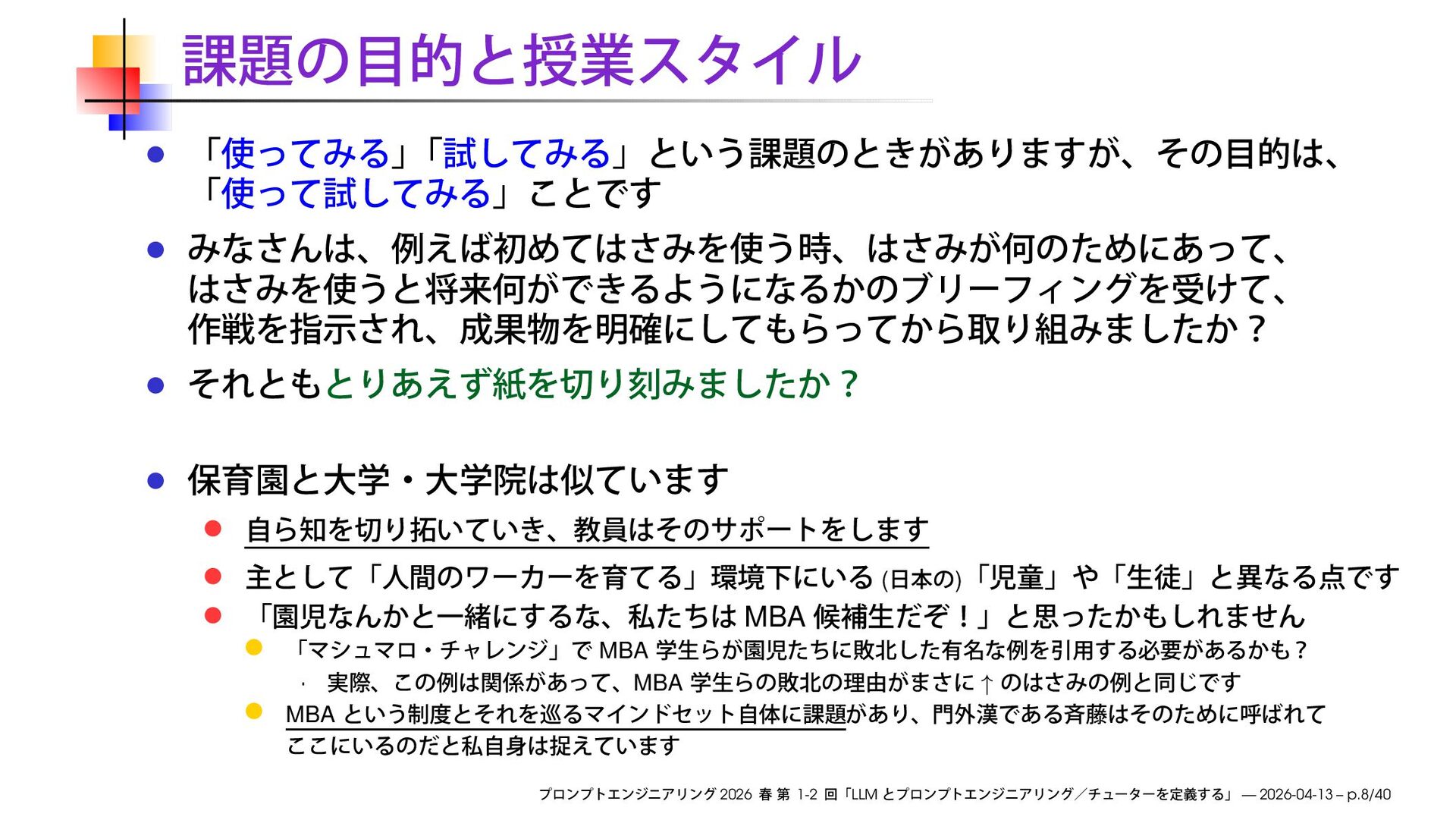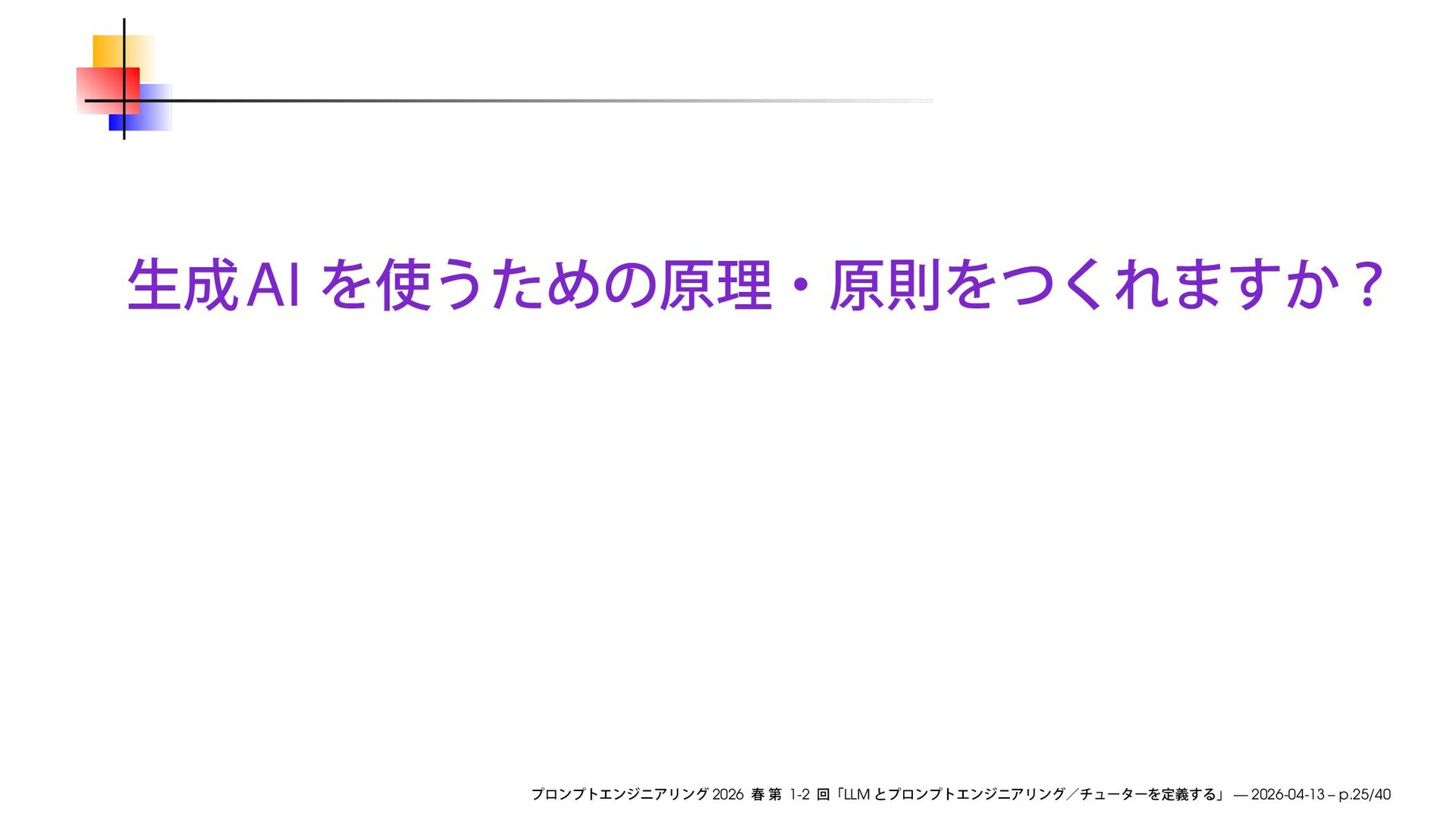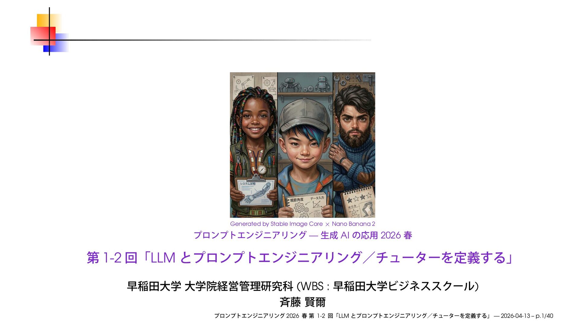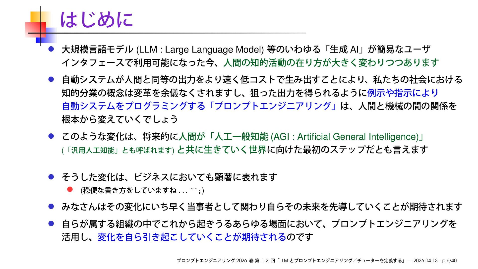 早稲田大学大学院経営管理研究科「プロンプトエンジニアリング ─ 生成AIの応用」2026 春の第1-2回で使用したスライドです。