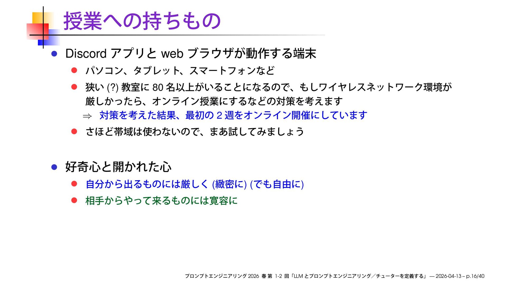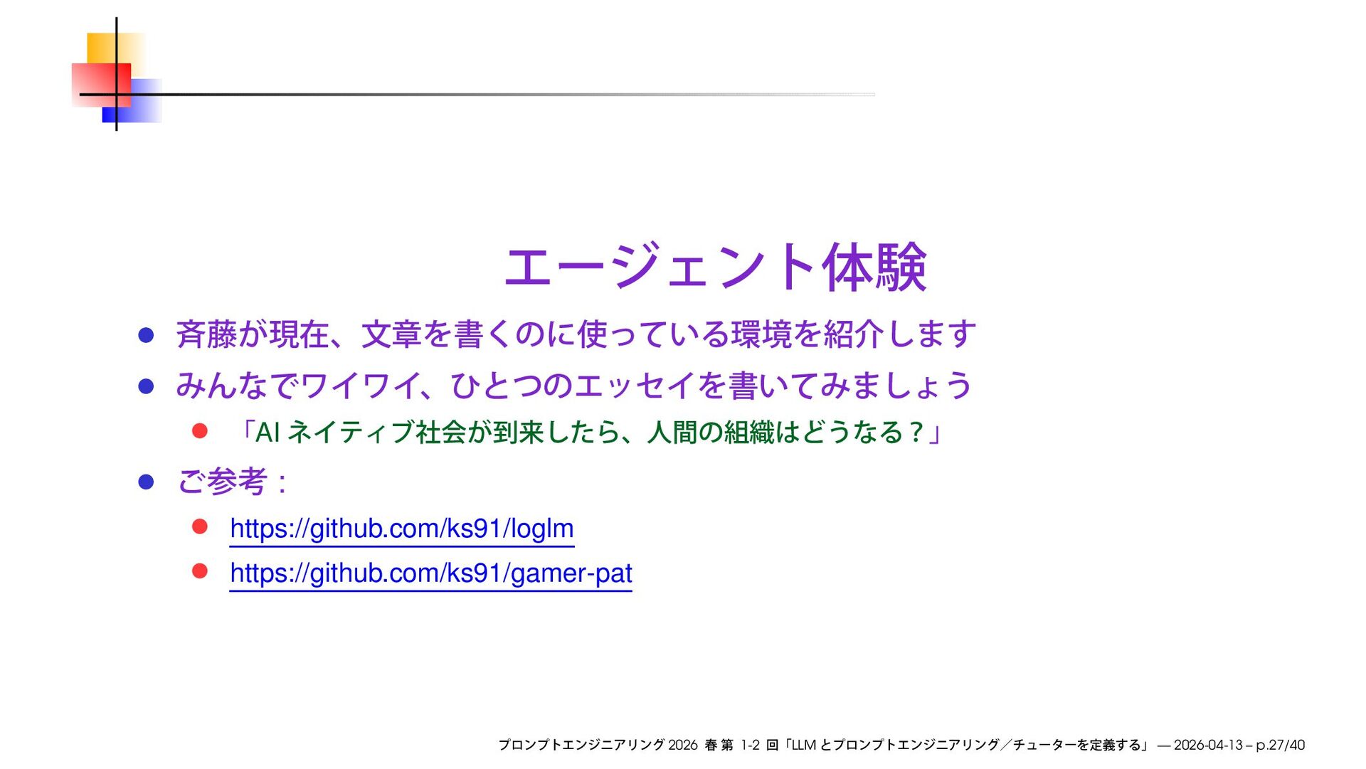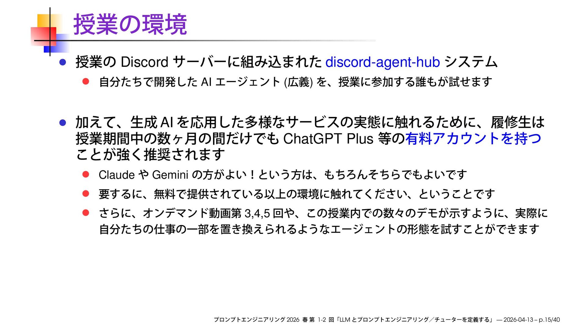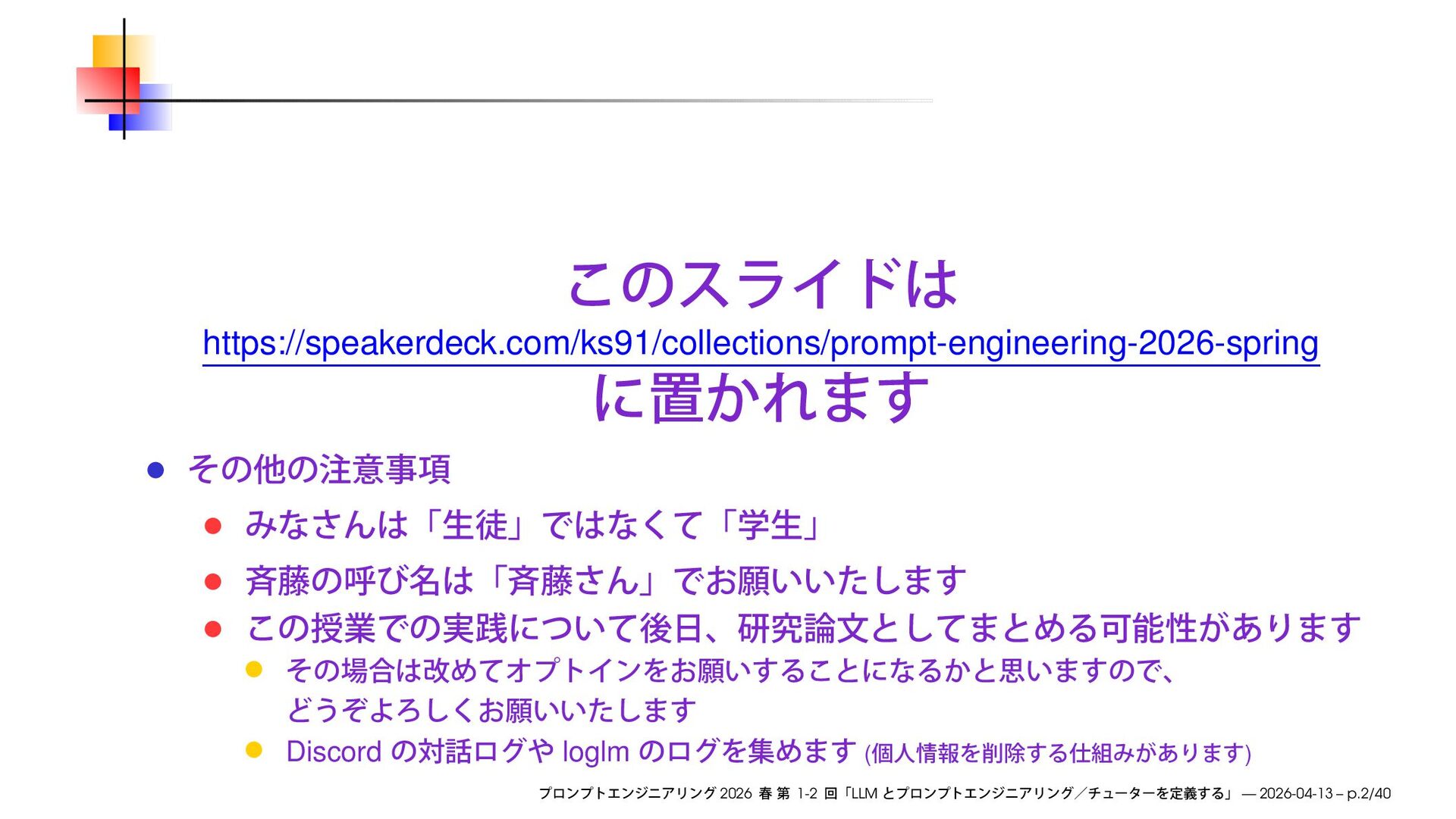 https://speakerdeck.com/ks91/collections/prompt-engineering-2026-spring Discord loglm ( ) 2026 1-2 LLM — 2026-04-13