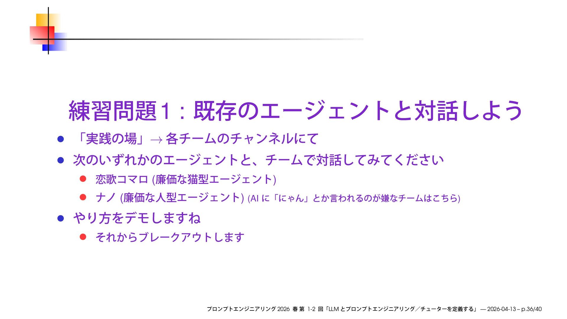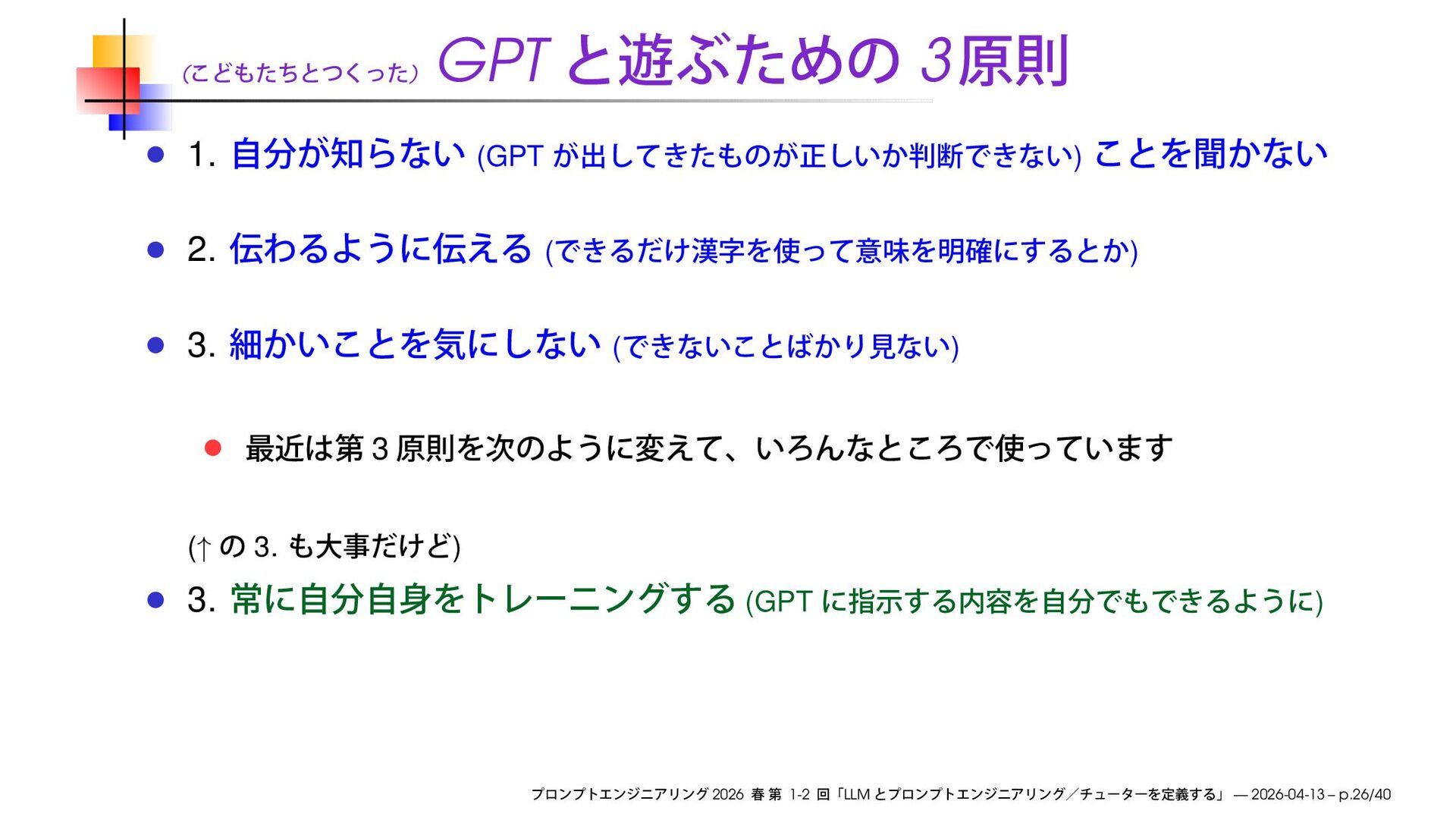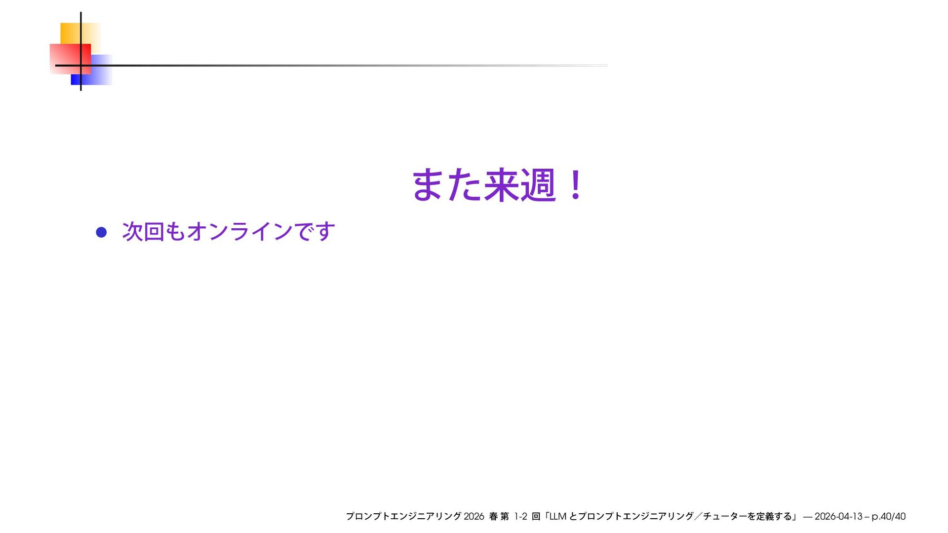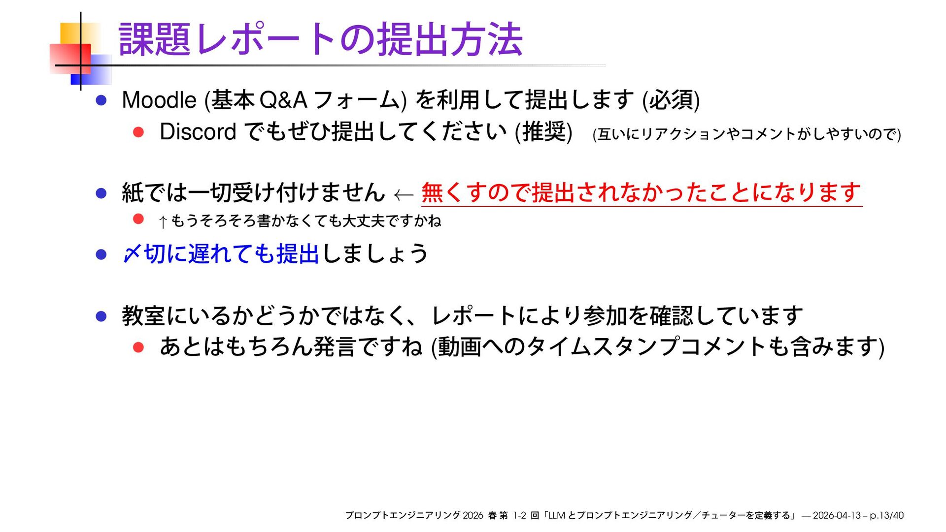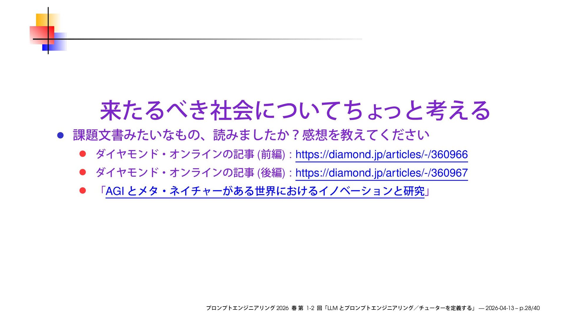 https://speakerdeck.com/ks91/collections/prompt-engineering-2026-spring Discord loglm ( ) 2026 1-2 LLM — 2026-04-13