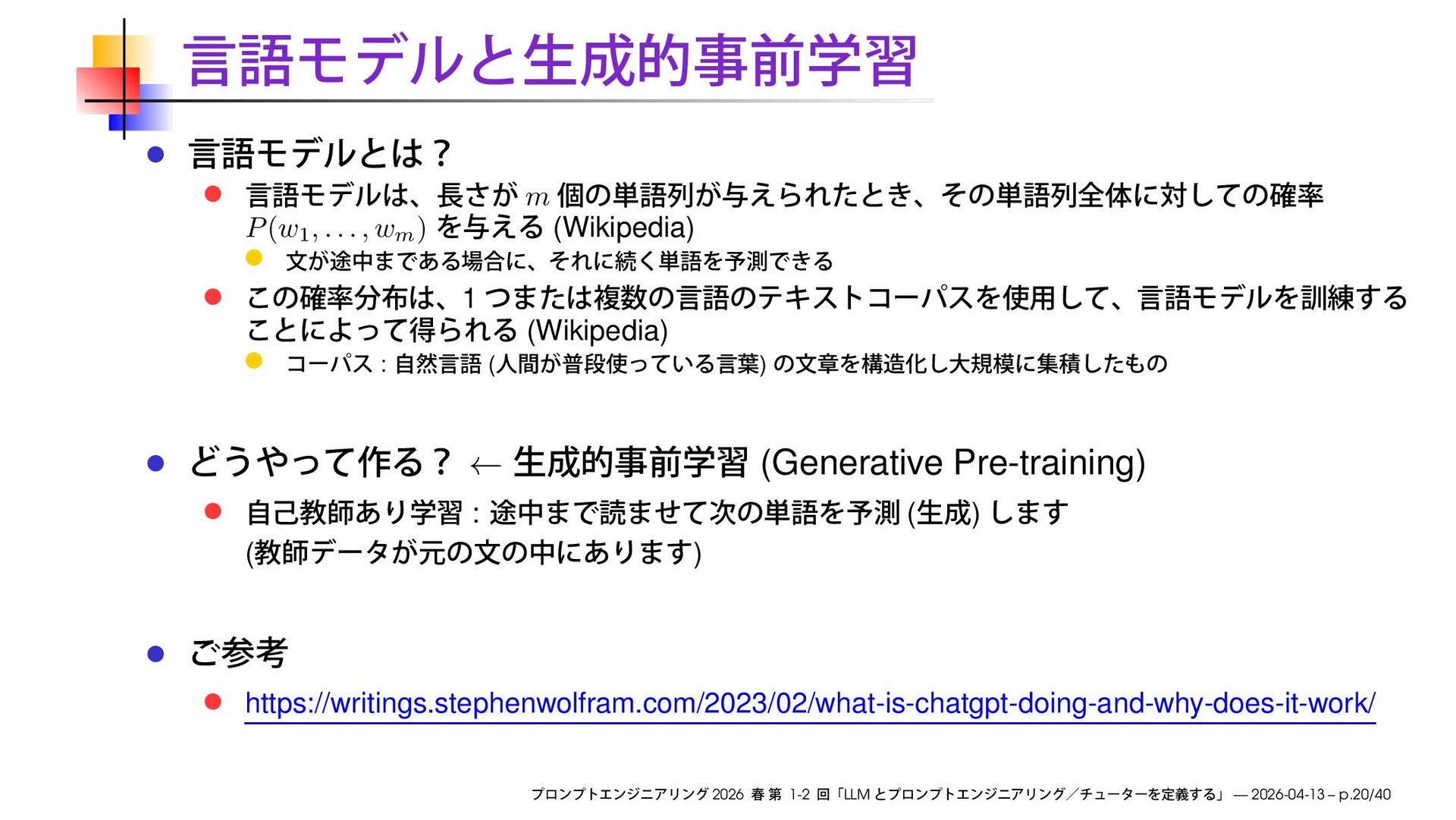 (Wikipedia) 1 (Wikipedia) : ( ) ← (Generative Pre-training) : ( ) ( ) https://writings.stephenwolfram.com/2023/02/what-is-chatgpt-doing-and-why-does-it-work/ 2026 1-2 LLM — 2026-04-13 – p.20/40