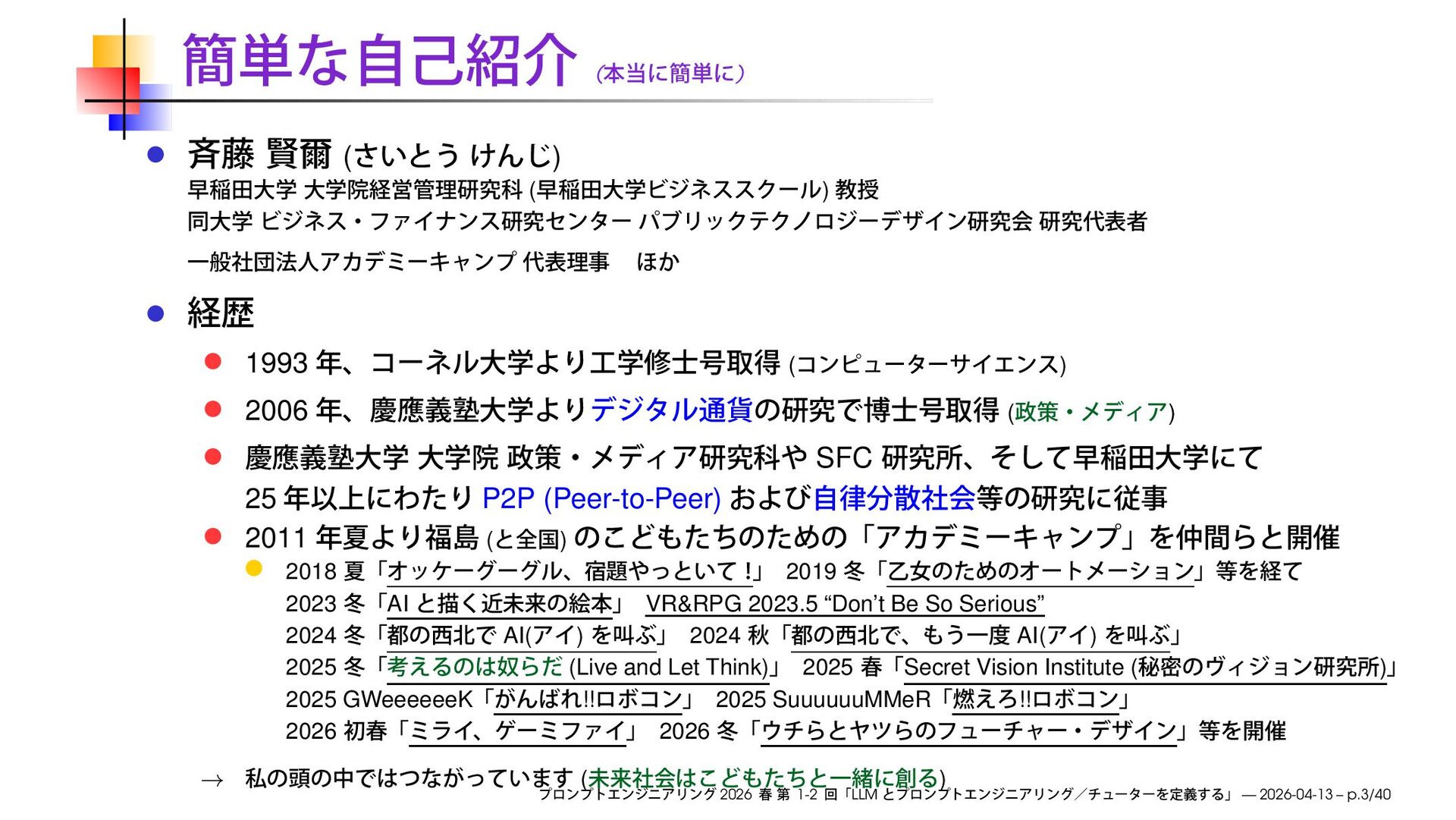 ( ) SFC 25 P2P (Peer-to-Peer) 2011 ( ) 2018 2019 2023 AI VR&RPG 2023.5 “Don’t Be So Serious” 2024 AI( ) 2024 AI( ) 2025 (Live and Let Think) 2025 Secret Vision Institute ( ) 2025 GWeeeeeeK !! 2025 SuuuuuuMMeR !! 2026 2026 → ( ) 2026 1-2 LLM — 2026-04-13 – p.3/40