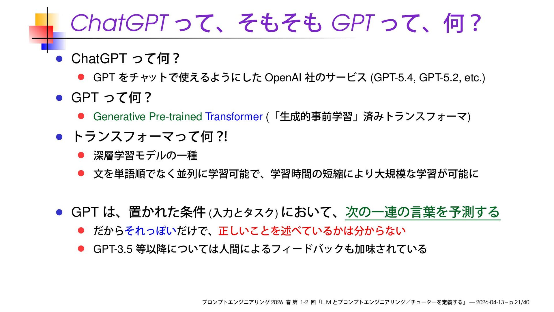 Pre-trained Transformer ( ) GPT ( ) GPT-3.5 2026 1-2 LLM — 2026-04-13 – p.21/40