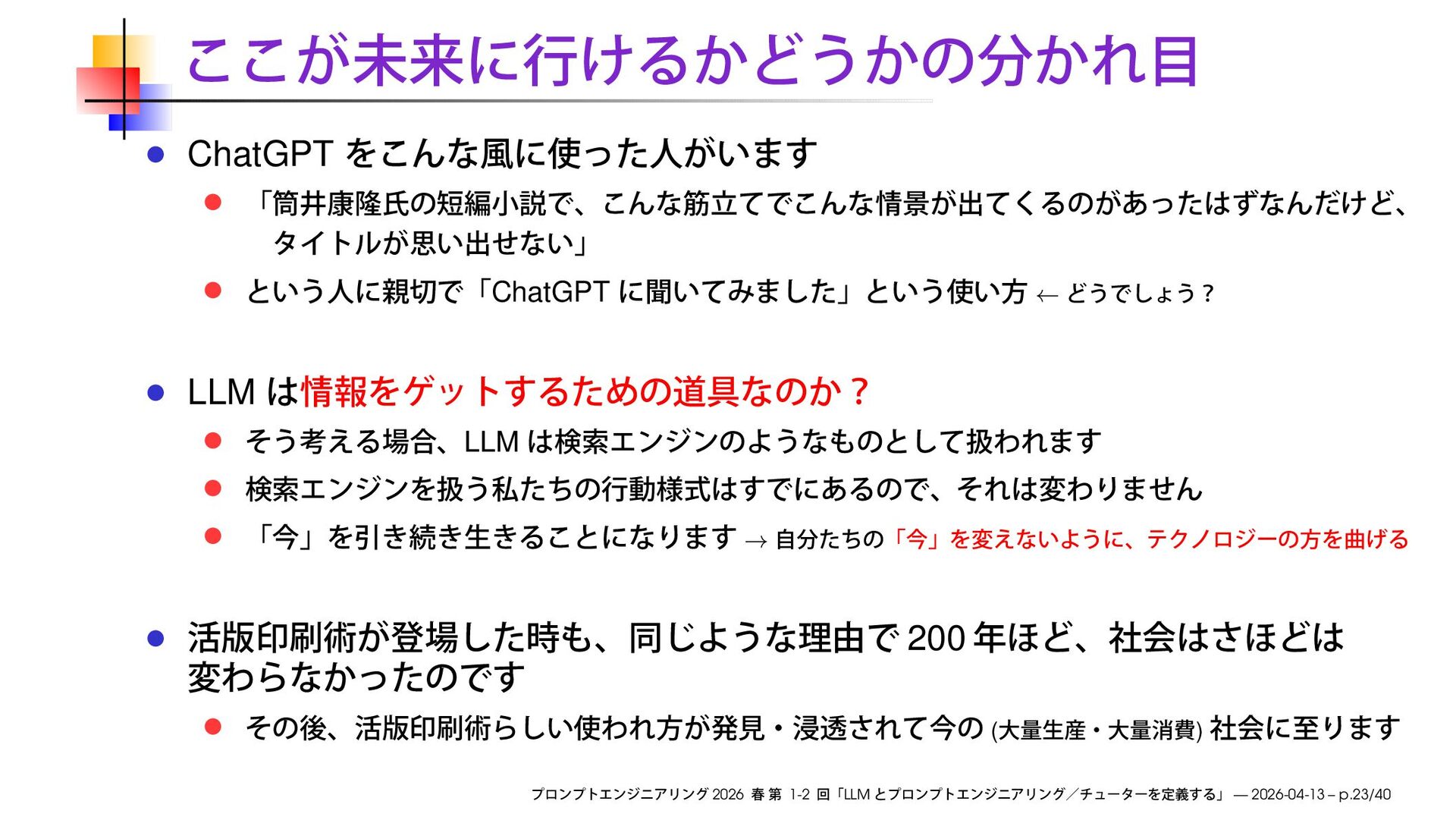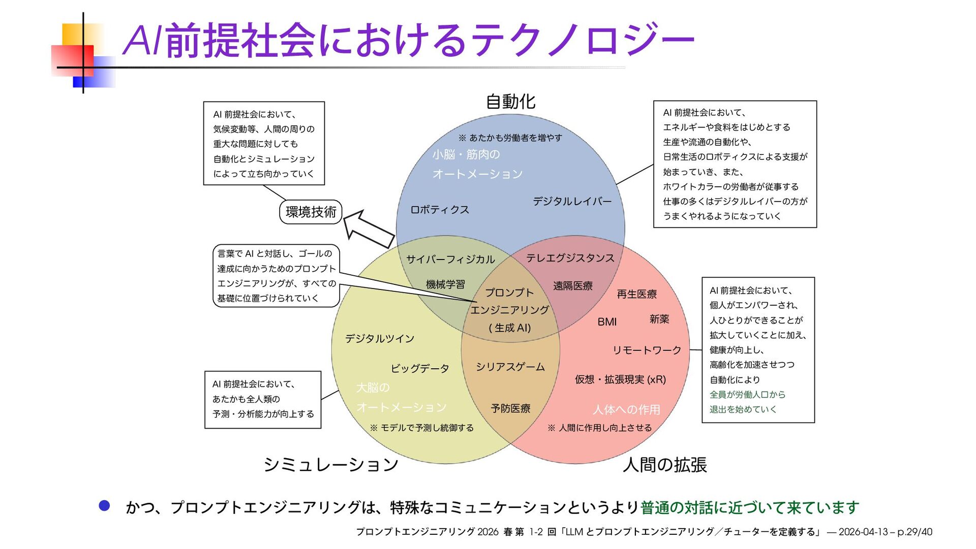˞ϞσϧͰ༧ଌ͠౷ޚ͢Δ େͷ Φʔτϝʔγϣϯ খɾےͷ Φʔτϝʔγϣϯ ਓମͷ࡞༻ σδλϧϨΠόʔ σδλϧπΠϯ αΠόʔϑΟδΧϧ ػցֶश ༧ҩྍ γϦΞεήʔϜ Ϗοάσʔλ ςϨΤάδελϯε ϦϞʔτϫʔΫ Ծɾ֦ுݱ࣮ Y3 ࠶ੜҩྍ #.* ৽ༀ ԕִҩྍ ϩϘςΟΫε ݴ༿Ͱ "* ͱର͠ɺΰʔϧͷ ୡʹ͔͏ͨΊͷϓϩϯϓτ ΤϯδχΞϦϯά͕ɺͯ͢ͷ جૅʹҐஔ͚ͮΒΕ͍ͯ͘ ڥٕज़ "* લఏࣾձʹ͓͍ͯɺ ؾީมಈɺਓؒͷपΓͷ ॏେͳʹରͯ͠ ࣗಈԽͱγϛϡϨʔγϣϯ ʹΑཱ͔͍ͬͯͪͬͯ͘ "* લఏࣾձʹ͓͍ͯɺ ΤωϧΪʔ৯ྉΛ͡Ίͱ͢Δ ੜ࢈ྲྀ௨ͷࣗಈԽɺ ৗੜ׆ͷϩϘςΟΫεʹΑΔࢧԉ͕ ࢝·͍͖ͬͯɺ·ͨɺ ϗϫΠτΧϥʔͷ࿑ಇऀ͕ैࣄ͢Δ ࣄͷଟ͘σδλϧϨΠόʔͷํ͕ ͏·͘ΕΔΑ͏ʹͳ͍ͬͯ͘ "* લఏࣾձʹ͓͍ͯɺ ݸਓ͕Τϯύϫʔ͞Εɺ ਓͻͱΓ͕Ͱ͖Δ͜ͱ͕ ֦େ͍ͯ͘͜͠ͱʹՃ͑ɺ ݈߁্͕͠ɺ ߴྸԽΛՃͤͭͭ͞ ࣗಈԽʹΑΓ શһ͕࿑ಇਓޱ͔Β ୀग़Λ࢝Ί͍ͯ͘ "* લఏࣾձʹ͓͍ͯɺ ͔͋ͨશਓྨͷ ༧ଌɾੳೳྗ্͕͢Δ 2026 1-2 LLM — 2026-04-13 – p.29/40