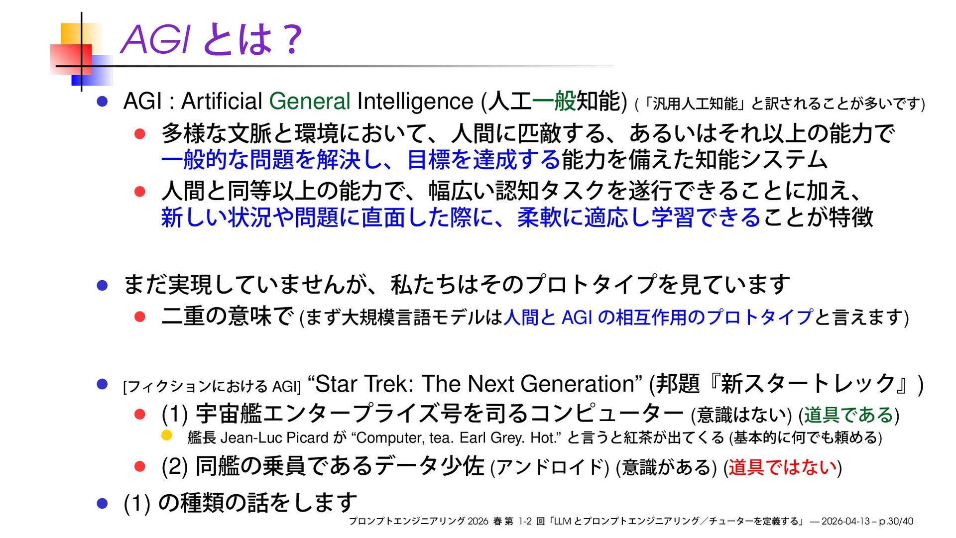 ( AGI ) [ AGI] “Star Trek: The Next Generation” ( ) (1) ( ) ( ) Jean-Luc Picard “Computer, tea. Earl Grey. Hot.” ( ) (2) ( ) ( ) ( ) (1) 2026 1-2 LLM — 2026-04-13 – p.30/40