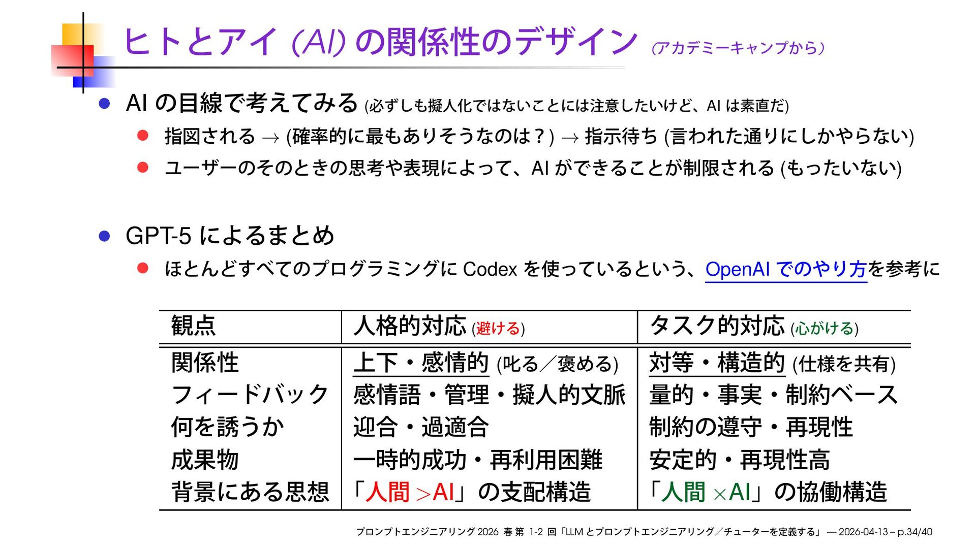 → ( ) AI ( ) GPT-5 Codex OpenAI ( ) ( ) ( ) ( ) >AI ×AI 2026 1-2 LLM — 2026-04-13 – p.34/40