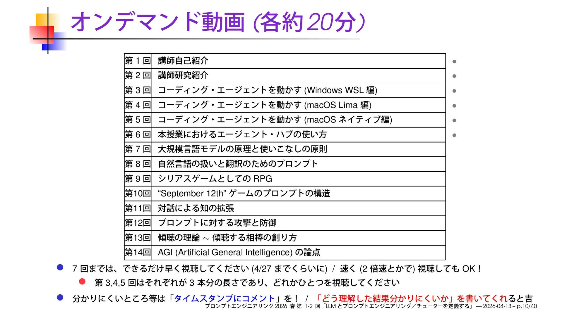 ) • 4 (macOS Lima ) • 5 (macOS ) • 6 • 7 8 9 RPG 10 “September 12th” 11 12 13 ∼ 14 AGI (Artificial General Intelligence) 7 (4/27 ) / (2 ) OK 3,4,5 3 / 2026 1-2 LLM — 2026-04-13 – p.10/40