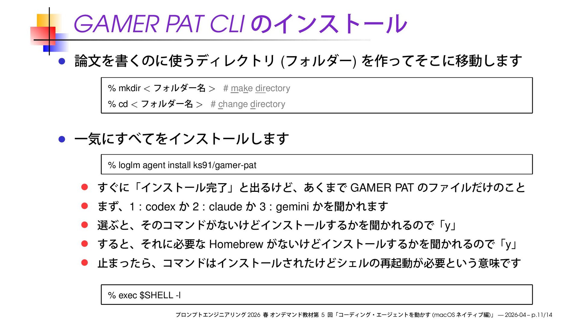 make directory % cd < > # change directory % loglm agent install ks91/gamer-pat GAMER PAT 1 : codex 2 : claude 3 : gemini y Homebrew y % exec $SHELL -l 2026 5 (macOS ) — 2026-04 – p.11/14