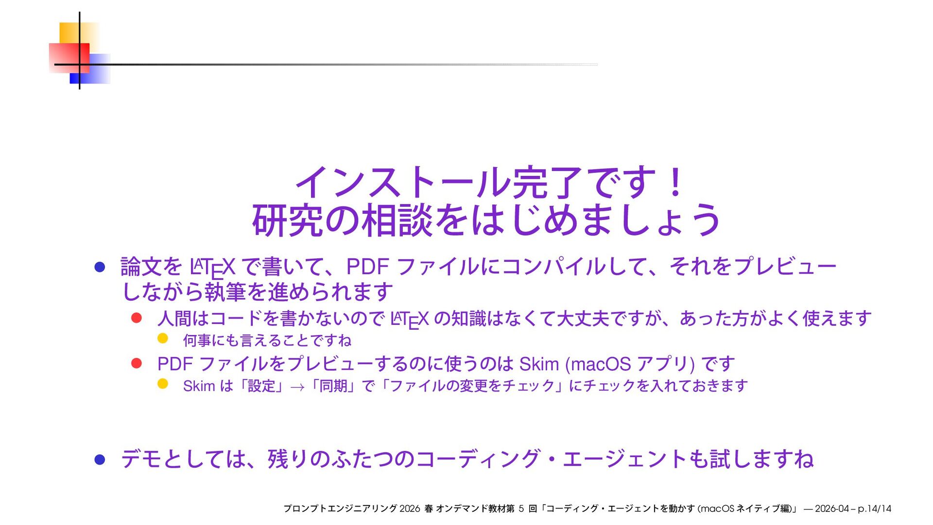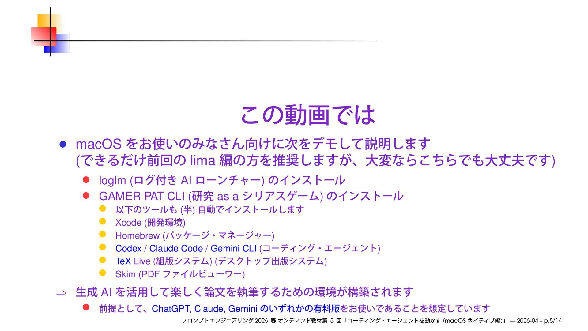 CLI ( as a ) ( ) Xcode ( ) Homebrew ( ) Codex / Claude Code / Gemini CLI ( ) TeX Live ( ) ( ) Skim (PDF ) ⇒ AI ChatGPT, Claude, Gemini 2026 5 (macOS ) — 2026-04 – p.5/14