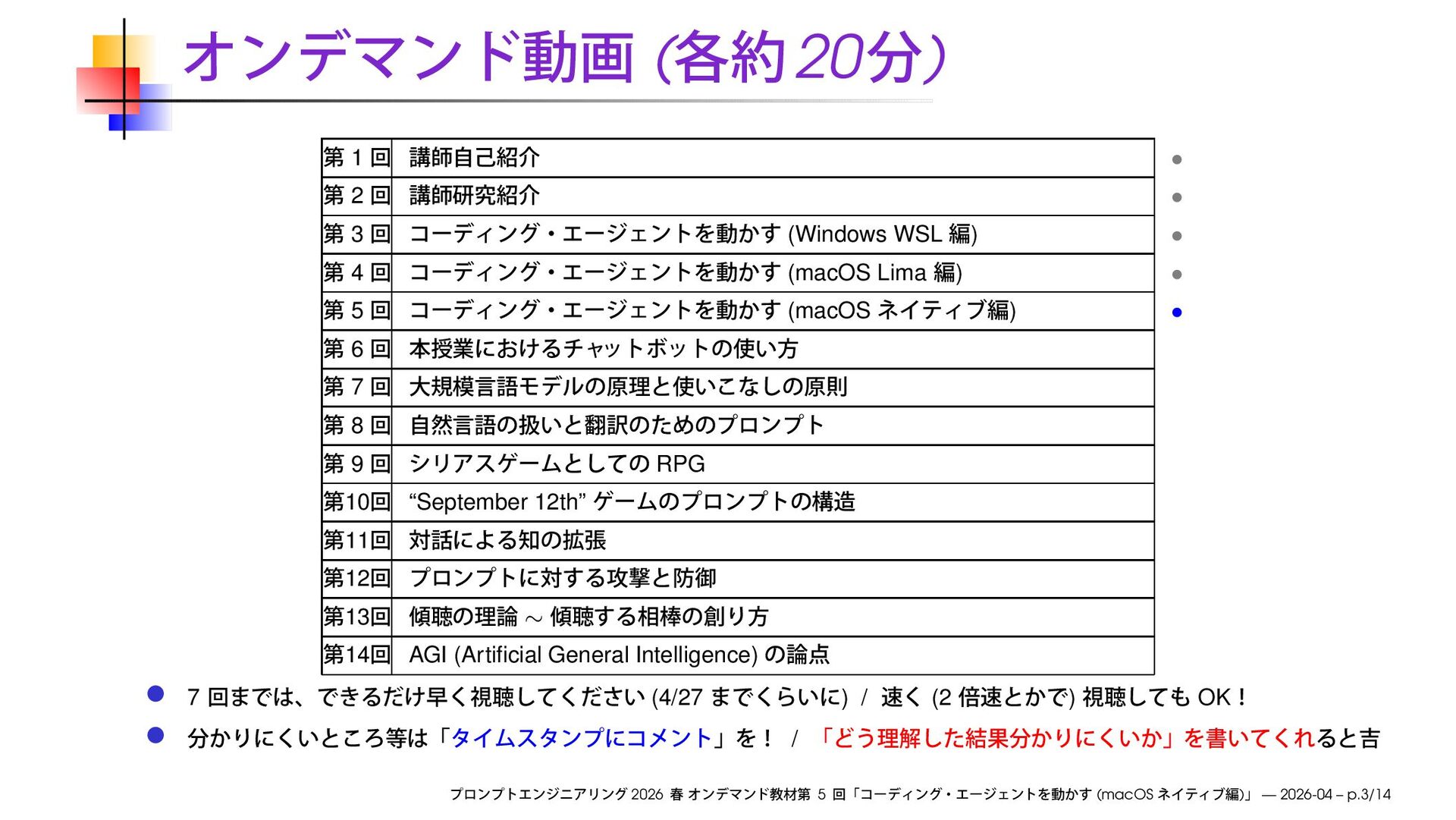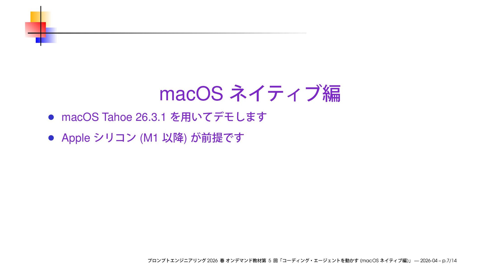 ) • 4 (macOS Lima ) • 5 (macOS ) • 6 7 8 9 RPG 10 “September 12th” 11 12 13 ∼ 14 AGI (Artificial General Intelligence) 7 (4/27 ) / (2 ) OK / 2026 5 (macOS ) — 2026-04 – p.3/14