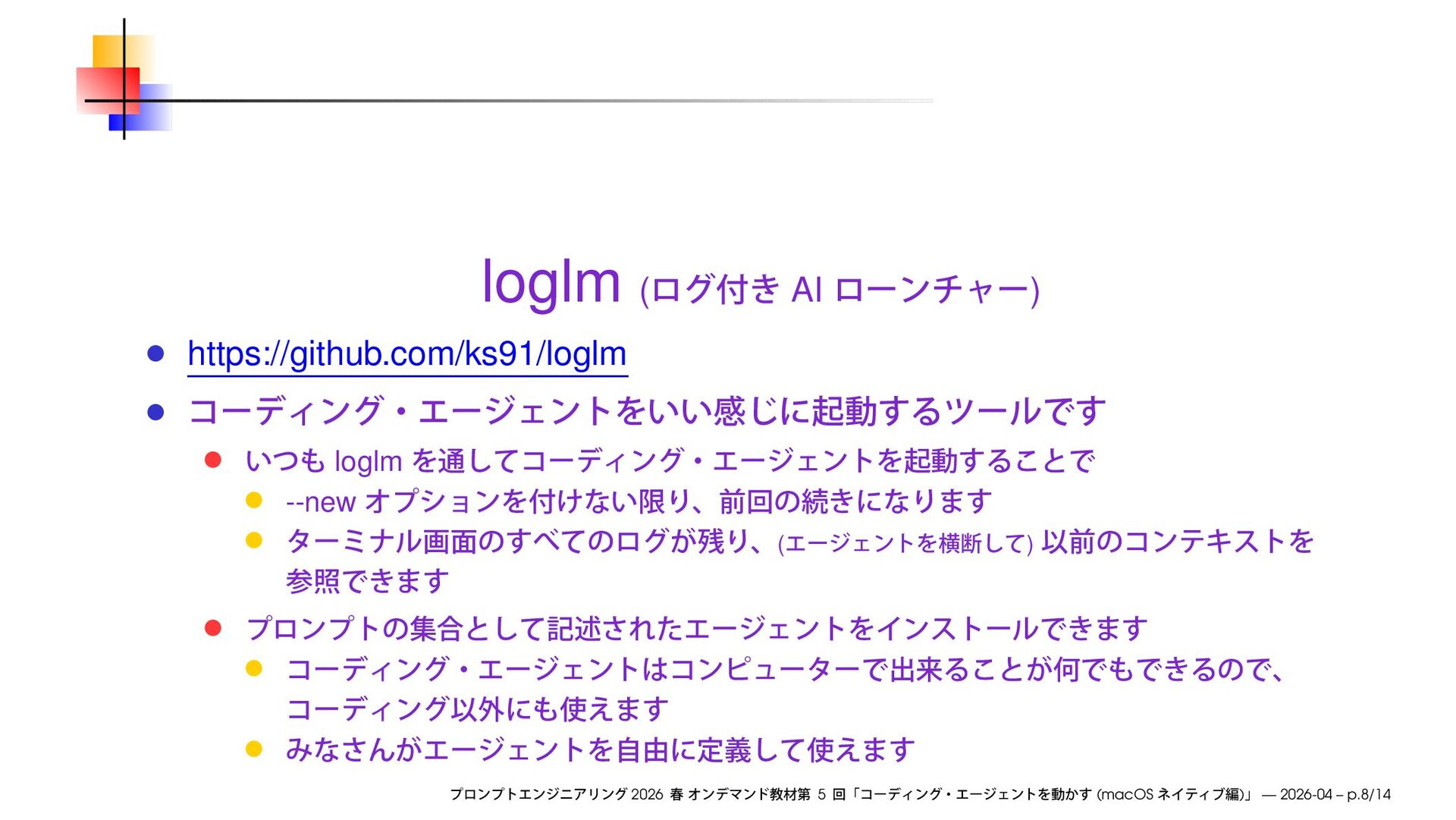 ( mkdir ) cd % loglm % loglm --agent 2026 5 (macOS ) — 2026-04 – p.12/14
