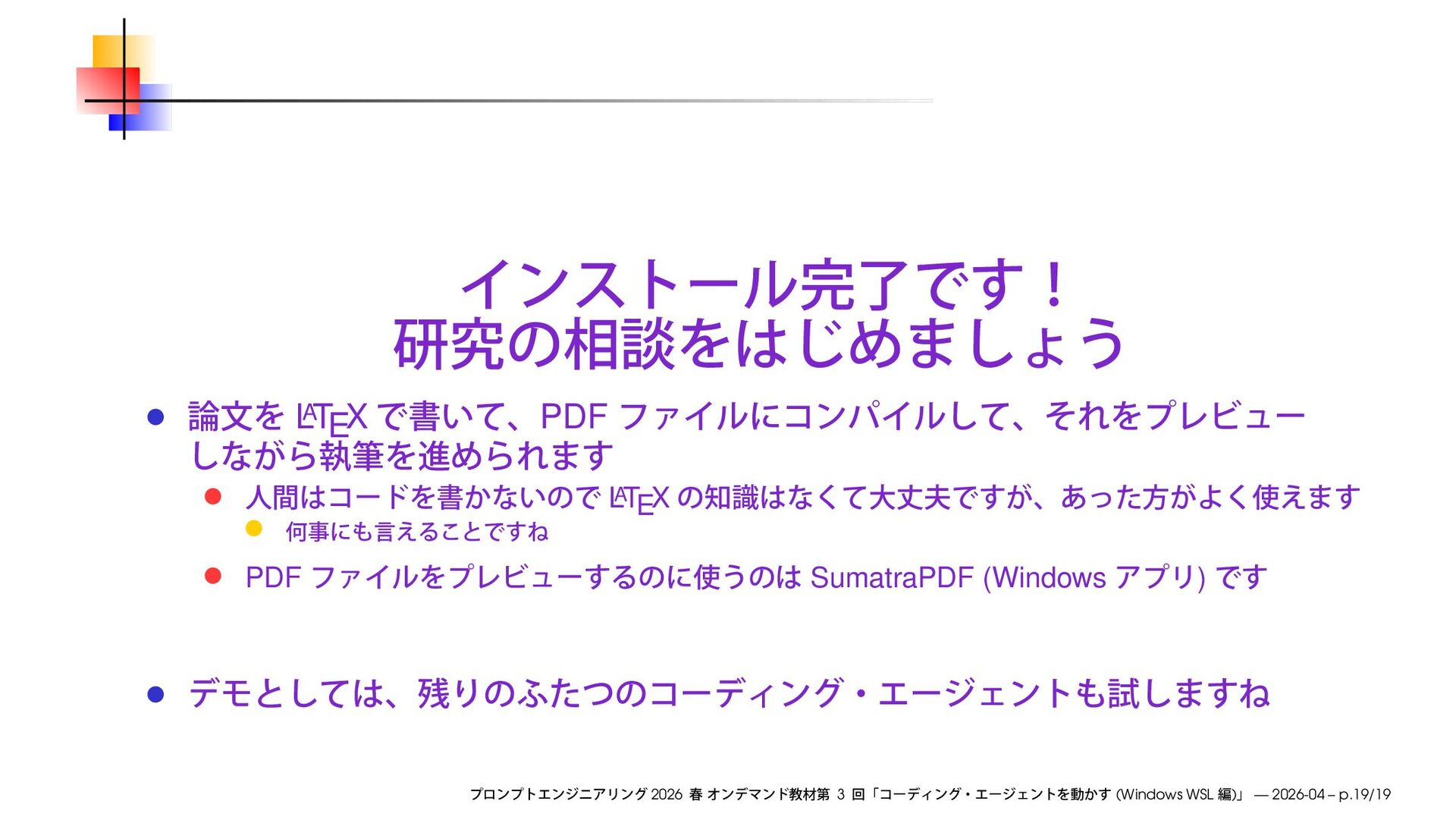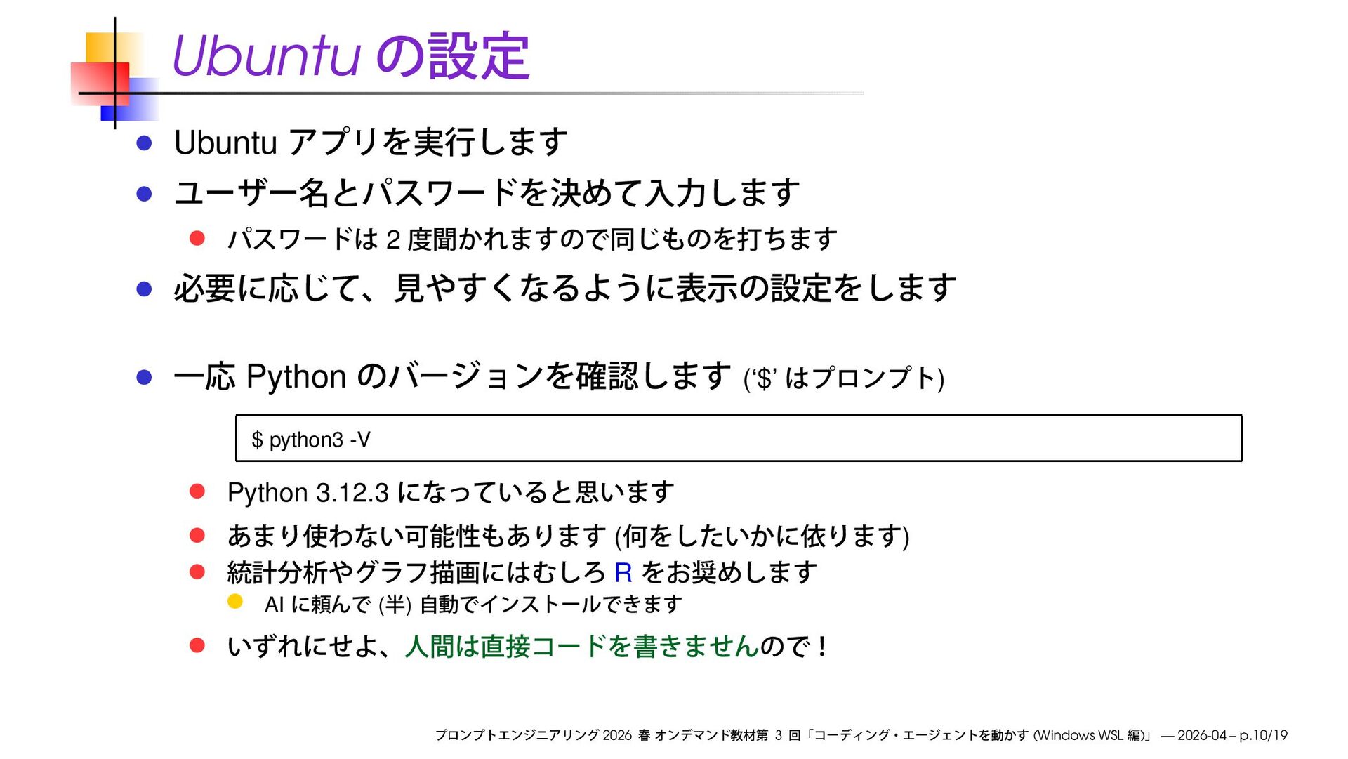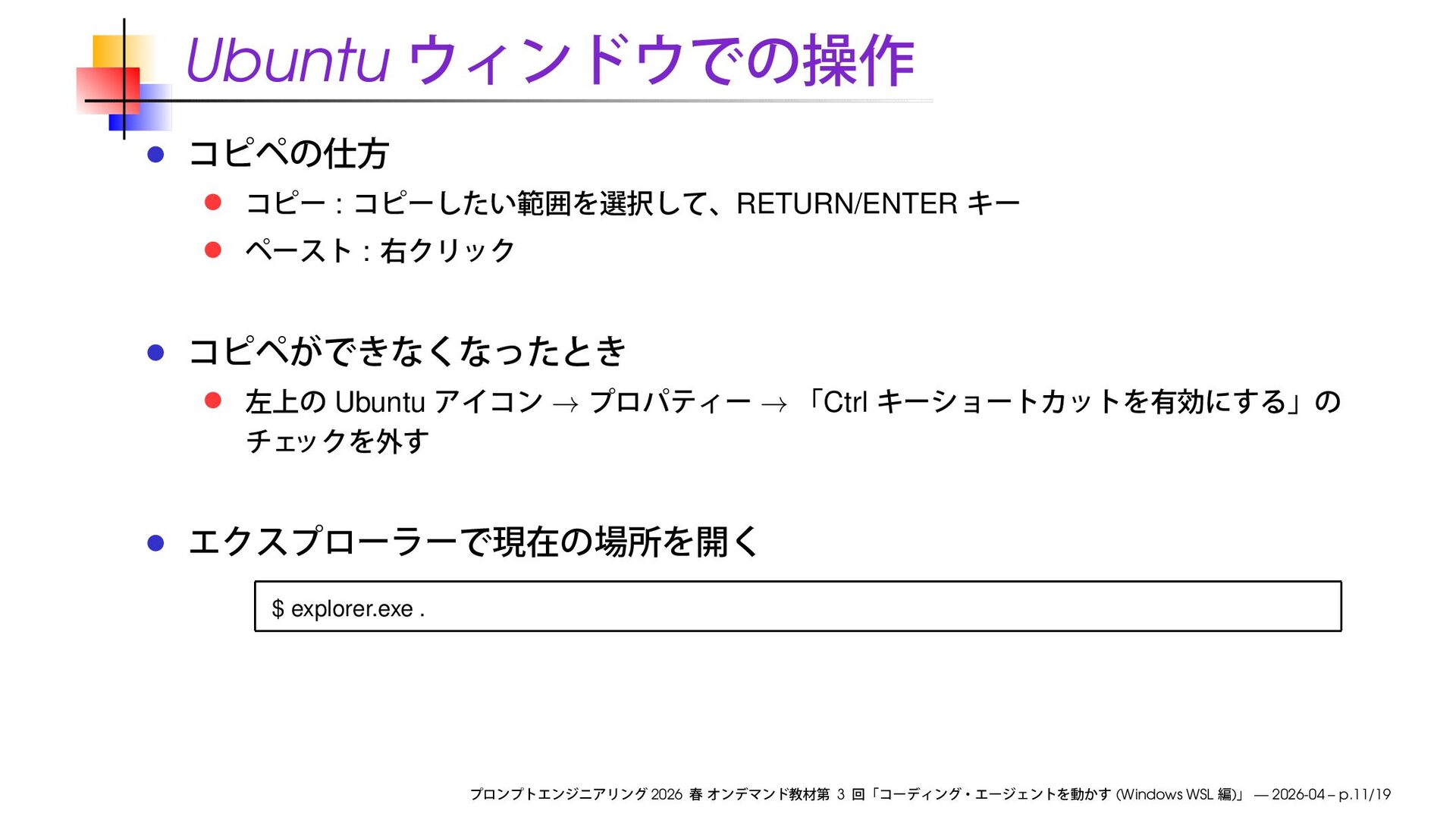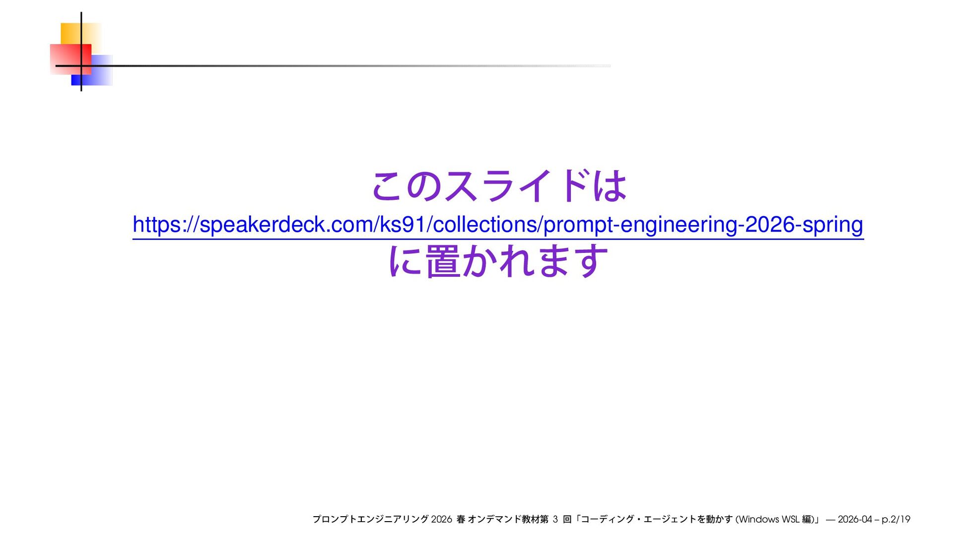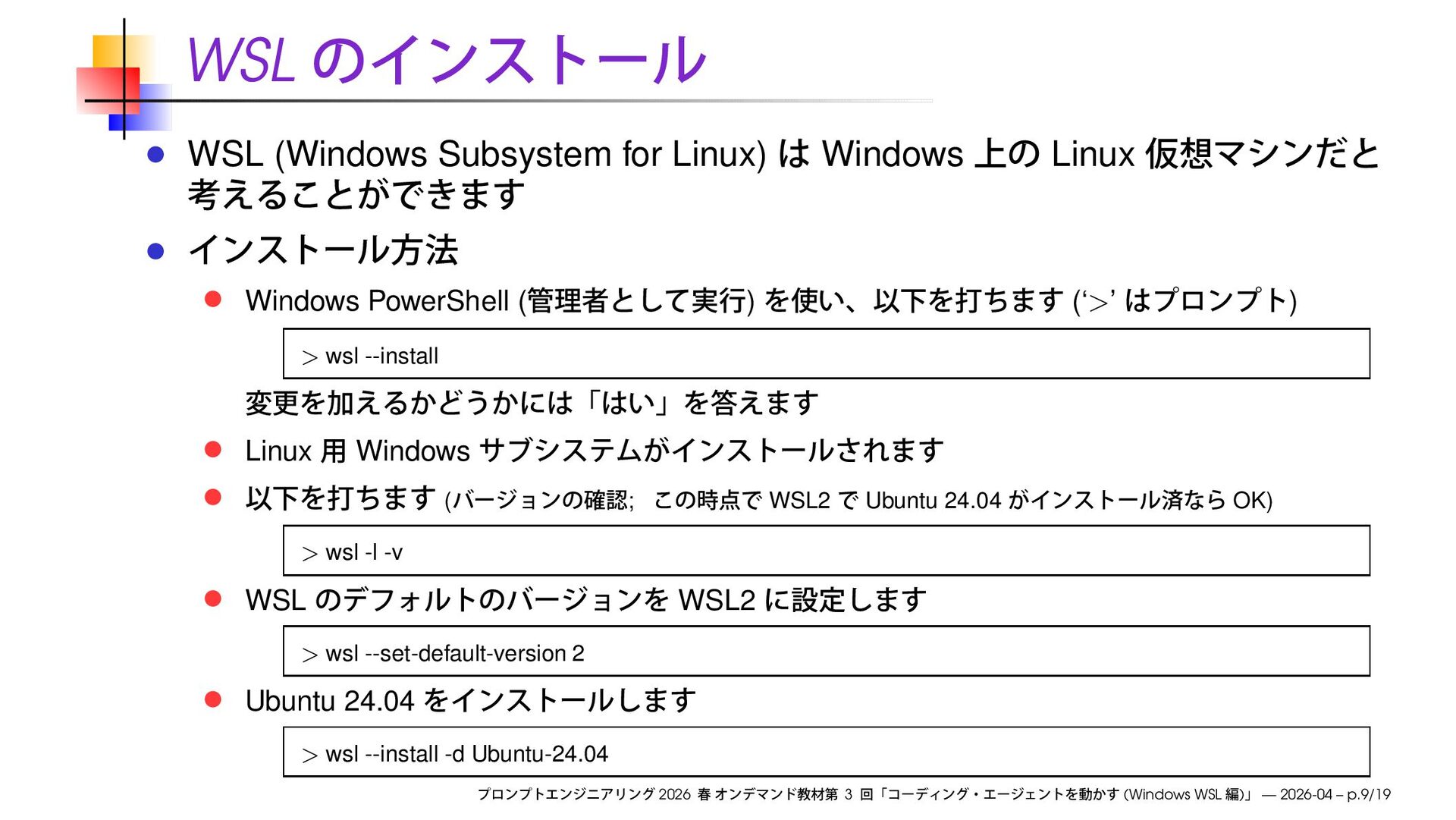 https://speakerdeck.com/ks91/collections/prompt-engineering-2026-spring 2026 3 (Windows WSL ) — 2026-04 – p.2/19
