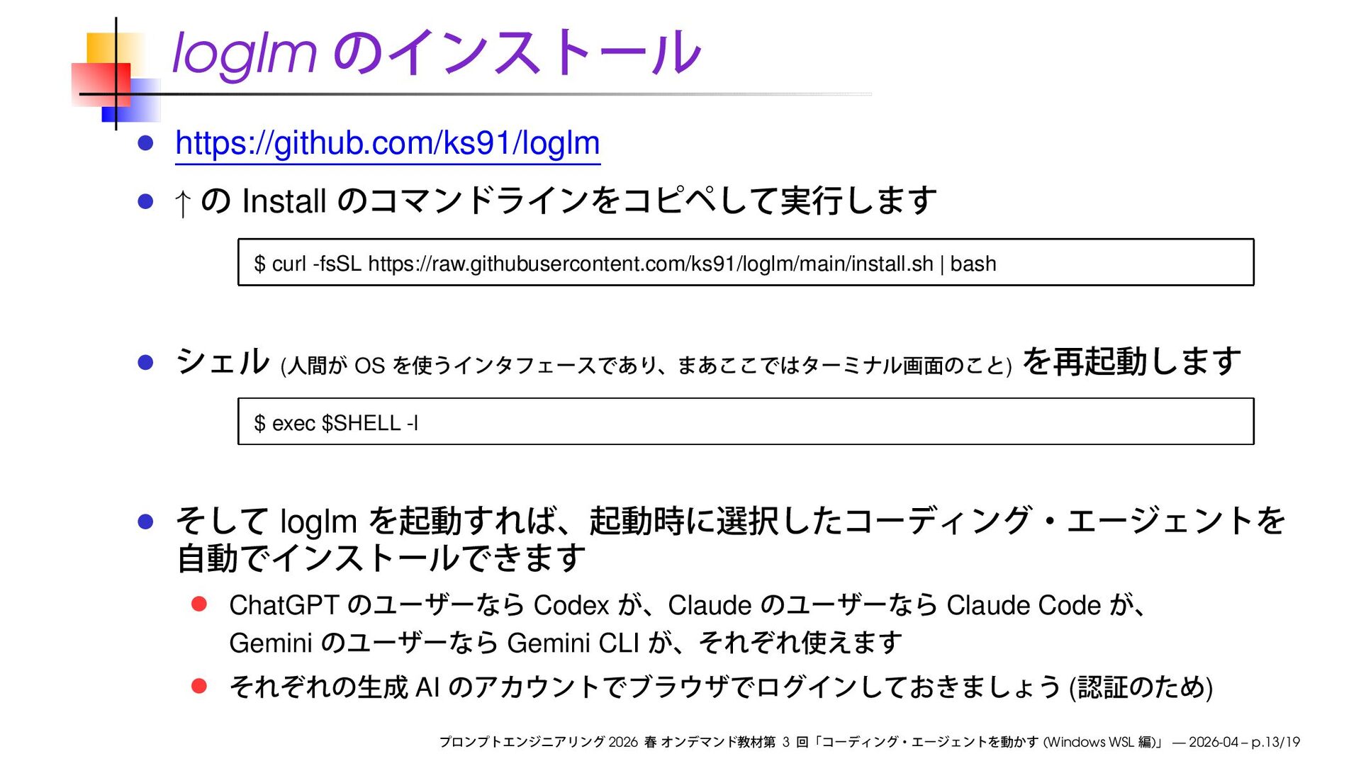 ( OS ) $ exec $SHELL -l loglm ChatGPT Codex Claude Claude Code Gemini Gemini CLI AI ( ) 2026 3 (Windows WSL ) — 2026-04 – p.13/19