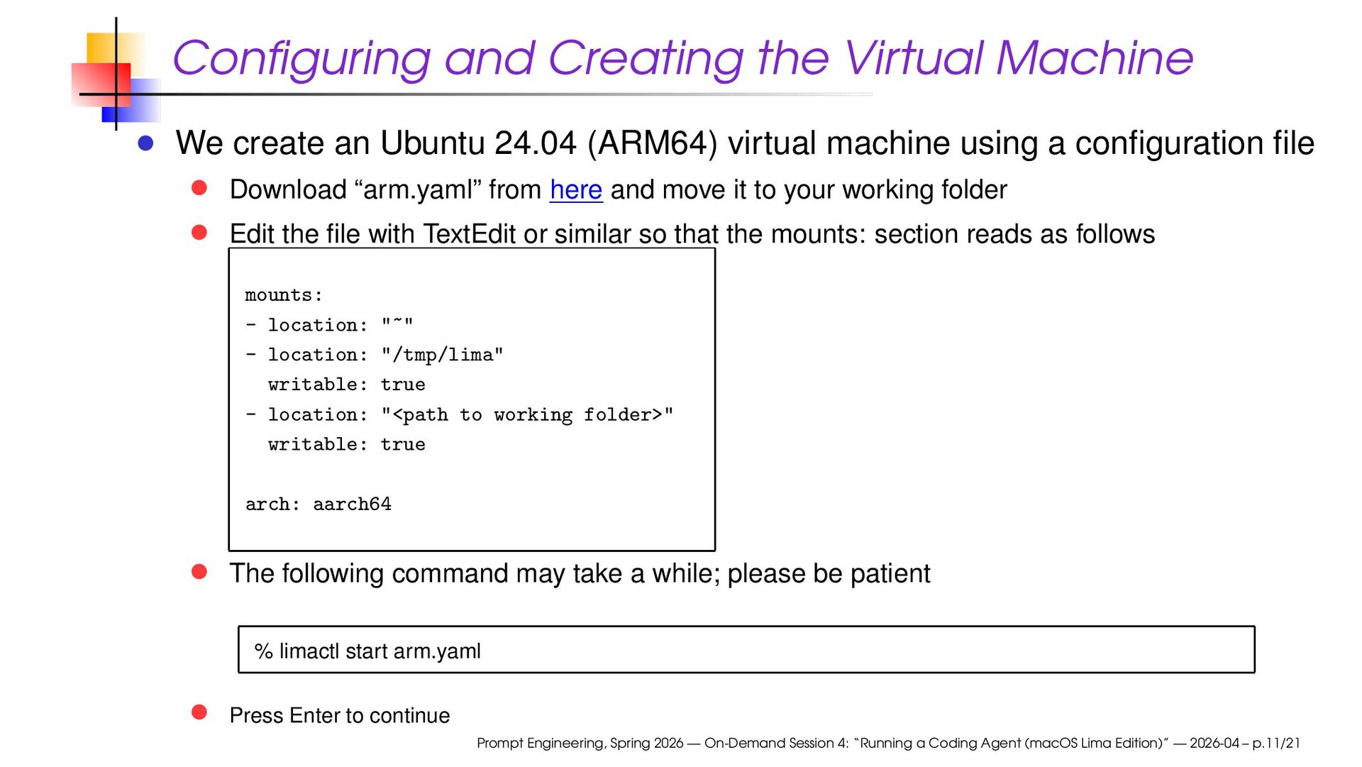 24.04 (ARM64) virtual machine using a configuration file Download “arm.yaml” from here and move it to your working folder Edit the file with TextEdit or similar so that the mounts: section reads as follows mounts: - location: "~" - location: "/tmp/lima" writable: true - location: "<path to working folder>" writable: true arch: aarch64 The following command may take a while; please be patient % limactl start arm.yaml Press Enter to continue Prompt Engineering, Spring 2026 — On-Demand Session 4: “Running a Coding Agent (macOS Lima Edition)” — 2026-04 – p.11/21