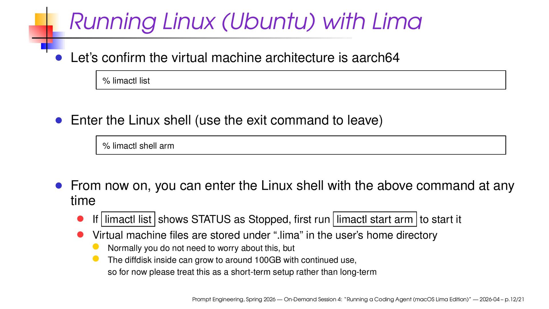 architecture is aarch64 % limactl list Enter the Linux shell (use the exit command to leave) % limactl shell arm From now on, you can enter the Linux shell with the above command at any time If limactl list shows STATUS as Stopped, first run limactl start arm to start it Virtual machine files are stored under “.lima” in the user’s home directory Normally you do not need to worry about this, but The diffdisk inside can grow to around 100GB with continued use, so for now please treat this as a short-term setup rather than long-term Prompt Engineering, Spring 2026 — On-Demand Session 4: “Running a Coding Agent (macOS Lima Edition)” — 2026-04 – p.12/21