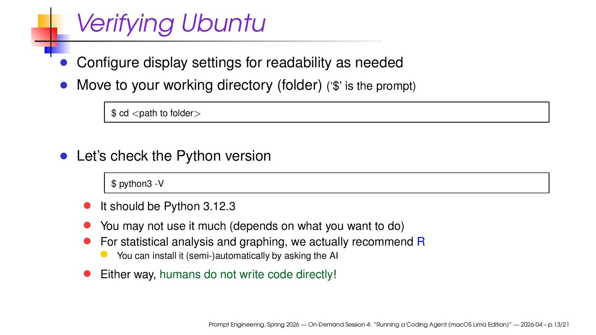 to your working directory (folder) (‘$’ is the prompt) $ cd <path to folder> Let’s check the Python version $ python3 -V It should be Python 3.12.3 You may not use it much (depends on what you want to do) For statistical analysis and graphing, we actually recommend R You can install it (semi-)automatically by asking the AI Either way, humans do not write code directly! Prompt Engineering, Spring 2026 — On-Demand Session 4: “Running a Coding Agent (macOS Lima Edition)” — 2026-04 – p.13/21