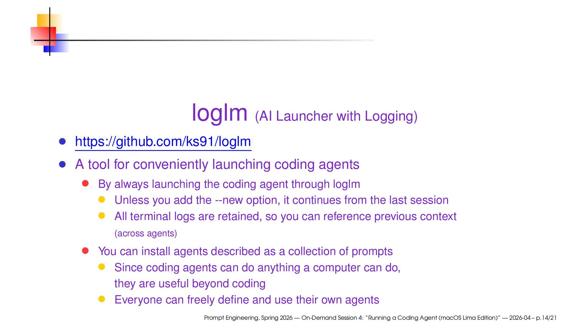 launching coding agents By always launching the coding agent through loglm Unless you add the --new option, it continues from the last session All terminal logs are retained, so you can reference previous context (across agents) You can install agents described as a collection of prompts Since coding agents can do anything a computer can do, they are useful beyond coding Everyone can freely define and use their own agents Prompt Engineering, Spring 2026 — On-Demand Session 4: “Running a Coding Agent (macOS Lima Edition)” — 2026-04 – p.14/21