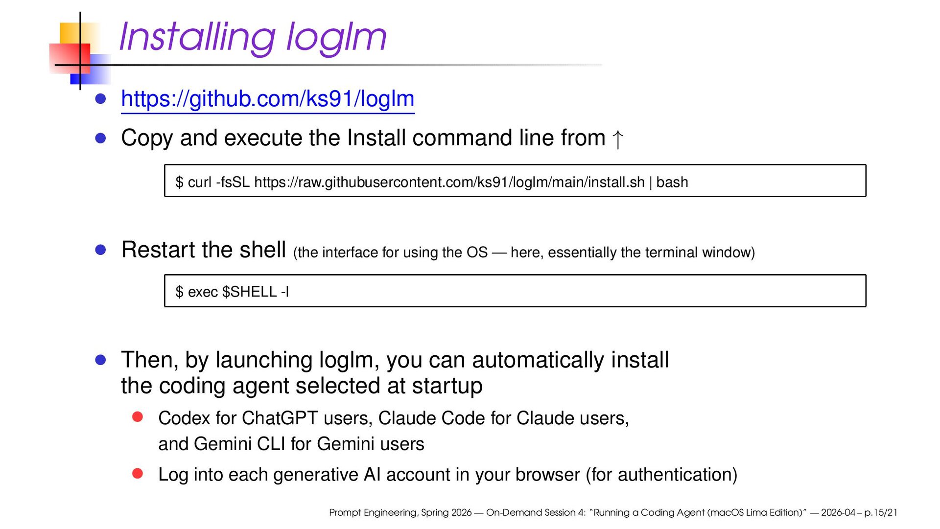 from ↑ $ curl -fsSL https://raw.githubusercontent.com/ks91/loglm/main/install.sh | bash Restart the shell (the interface for using the OS — here, essentially the terminal window) $ exec $SHELL -l Then, by launching loglm, you can automatically install the coding agent selected at startup Codex for ChatGPT users, Claude Code for Claude users, and Gemini CLI for Gemini users Log into each generative AI account in your browser (for authentication) Prompt Engineering, Spring 2026 — On-Demand Session 4: “Running a Coding Agent (macOS Lima Edition)” — 2026-04 – p.15/21