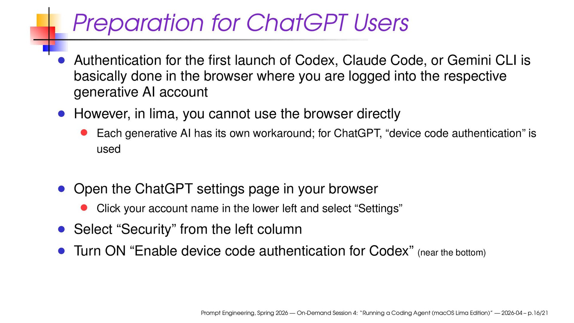 Codex, Claude Code, or Gemini CLI is basically done in the browser where you are logged into the respective generative AI account However, in lima, you cannot use the browser directly Each generative AI has its own workaround; for ChatGPT, “device code authentication” is used Open the ChatGPT settings page in your browser Click your account name in the lower left and select “Settings” Select “Security” from the left column Turn ON “Enable device code authentication for Codex” (near the bottom) Prompt Engineering, Spring 2026 — On-Demand Session 4: “Running a Coding Agent (macOS Lima Edition)” — 2026-04 – p.16/21