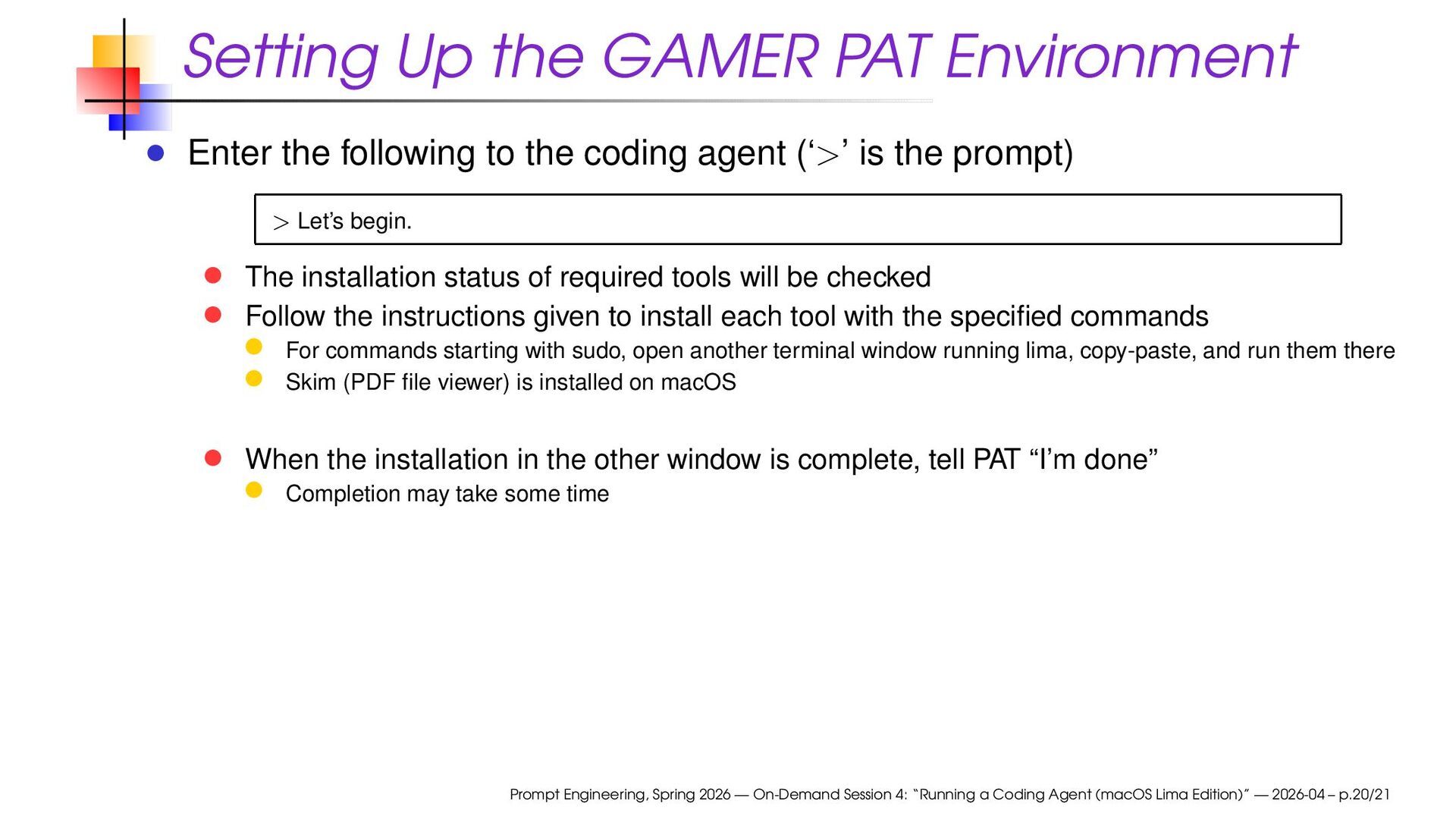 the coding agent (‘>’ is the prompt) > Let’s begin. The installation status of required tools will be checked Follow the instructions given to install each tool with the specified commands For commands starting with sudo, open another terminal window running lima, copy-paste, and run them there Skim (PDF file viewer) is installed on macOS When the installation in the other window is complete, tell PAT “I’m done” Completion may take some time Prompt Engineering, Spring 2026 — On-Demand Session 4: “Running a Coding Agent (macOS Lima Edition)” — 2026-04 – p.20/21