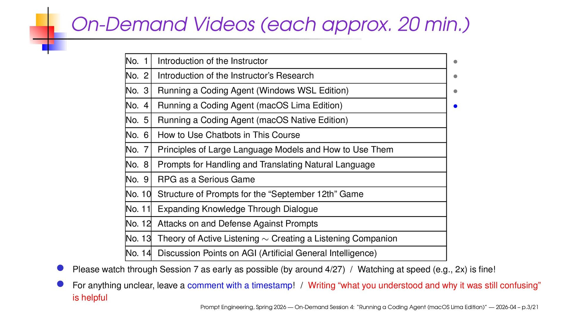 the Instructor • No. 2 Introduction of the Instructor’s Research • No. 3 Running a Coding Agent (Windows WSL Edition) • No. 4 Running a Coding Agent (macOS Lima Edition) • No. 5 Running a Coding Agent (macOS Native Edition) No. 6 How to Use Chatbots in This Course No. 7 Principles of Large Language Models and How to Use Them No. 8 Prompts for Handling and Translating Natural Language No. 9 RPG as a Serious Game No. 10 Structure of Prompts for the “September 12th” Game No. 11 Expanding Knowledge Through Dialogue No. 12 Attacks on and Defense Against Prompts No. 13 Theory of Active Listening ∼ Creating a Listening Companion No. 14 Discussion Points on AGI (Artificial General Intelligence) Please watch through Session 7 as early as possible (by around 4/27) / Watching at speed (e.g., 2x) is fine! For anything unclear, leave a comment with a timestamp! / Writing “what you understood and why it was still confusing” is helpful Prompt Engineering, Spring 2026 — On-Demand Session 4: “Running a Coding Agent (macOS Lima Edition)” — 2026-04 – p.3/21