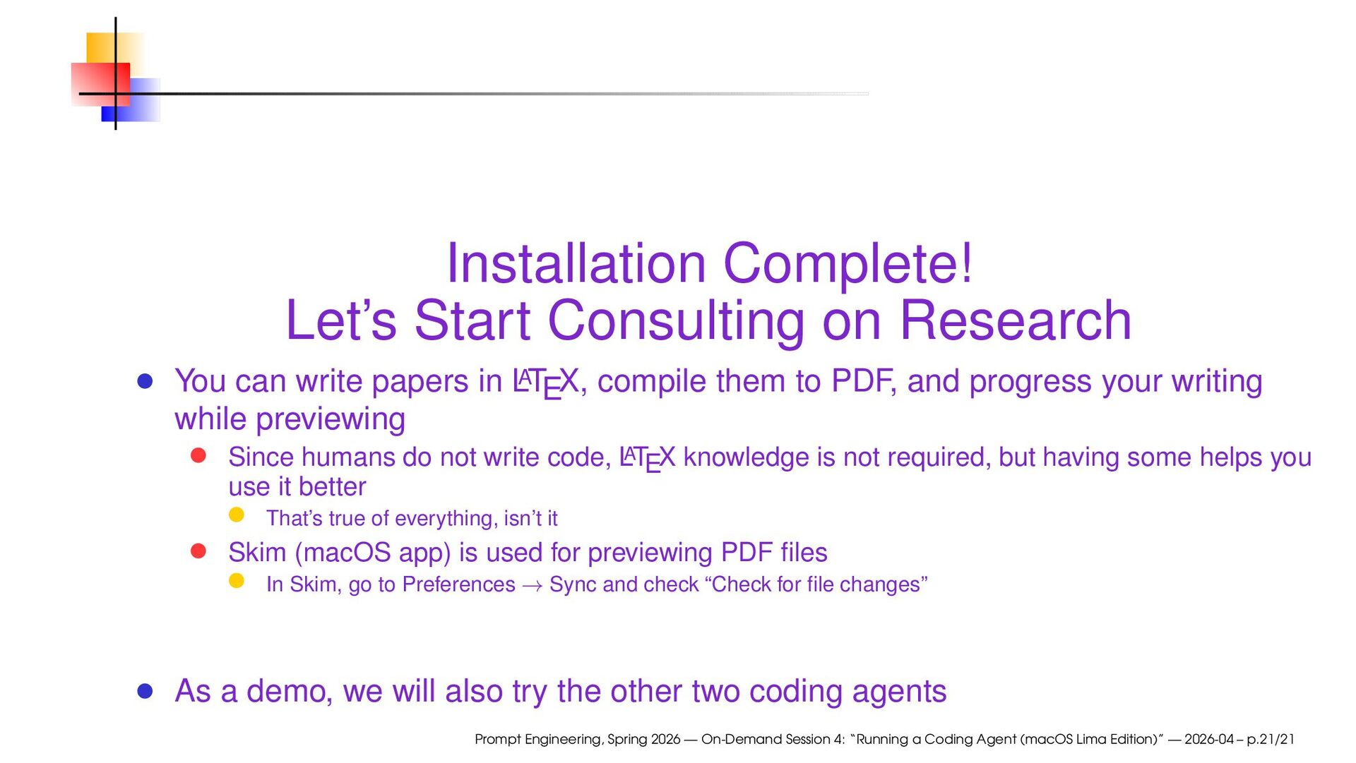 papers in L A TEX, compile them to PDF, and progress your writing while previewing Since humans do not write code, L A TEX knowledge is not required, but having some helps you use it better That’s true of everything, isn’t it Skim (macOS app) is used for previewing PDF files In Skim, go to Preferences → Sync and check “Check for file changes” As a demo, we will also try the other two coding agents Prompt Engineering, Spring 2026 — On-Demand Session 4: “Running a Coding Agent (macOS Lima Edition)” — 2026-04 – p.21/21