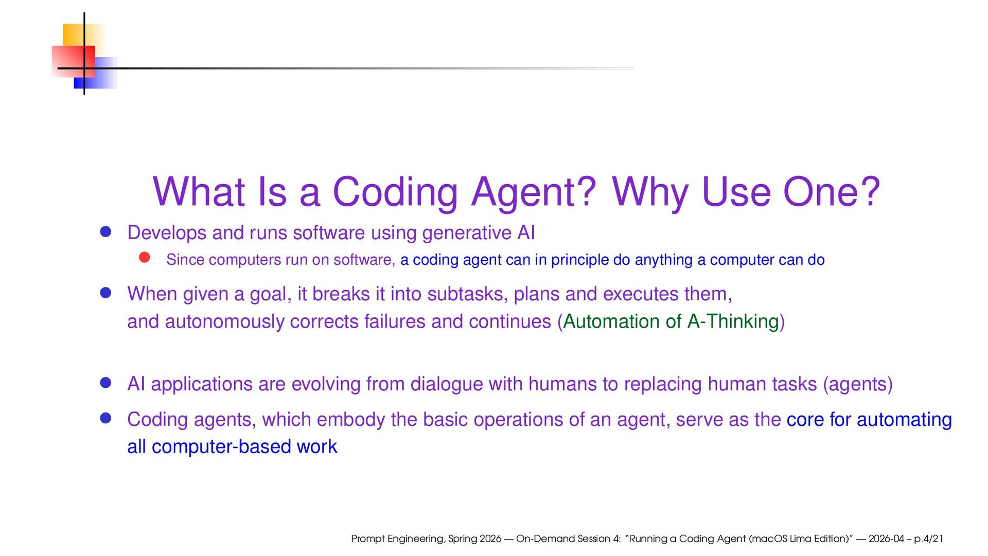 runs software using generative AI Since computers run on software, a coding agent can in principle do anything a computer can do When given a goal, it breaks it into subtasks, plans and executes them, and autonomously corrects failures and continues (Automation of A-Thinking) AI applications are evolving from dialogue with humans to replacing human tasks (agents) Coding agents, which embody the basic operations of an agent, serve as the core for automating all computer-based work Prompt Engineering, Spring 2026 — On-Demand Session 4: “Running a Coding Agent (macOS Lima Edition)” — 2026-04 – p.4/21