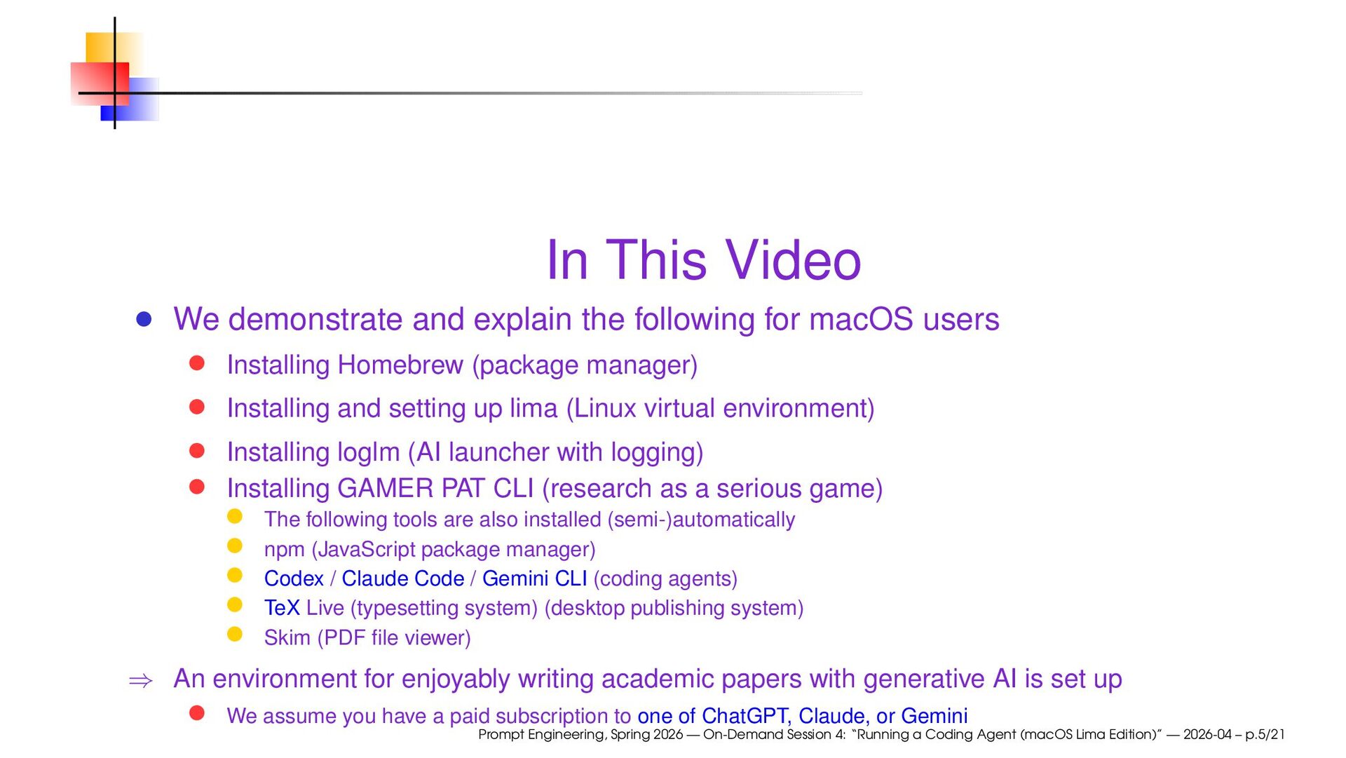 macOS users Installing Homebrew (package manager) Installing and setting up lima (Linux virtual environment) Installing loglm (AI launcher with logging) Installing GAMER PAT CLI (research as a serious game) The following tools are also installed (semi-)automatically npm (JavaScript package manager) Codex / Claude Code / Gemini CLI (coding agents) TeX Live (typesetting system) (desktop publishing system) Skim (PDF file viewer) ⇒ An environment for enjoyably writing academic papers with generative AI is set up We assume you have a paid subscription to one of ChatGPT, Claude, or Gemini Prompt Engineering, Spring 2026 — On-Demand Session 4: “Running a Coding Agent (macOS Lima Edition)” — 2026-04 – p.5/21