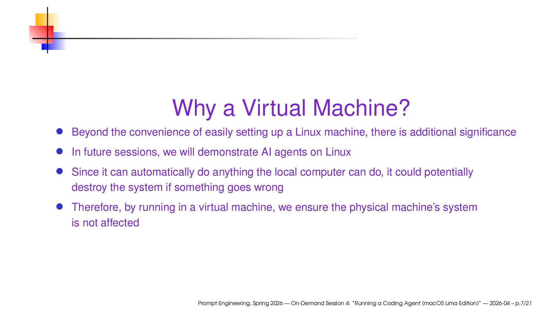 up a Linux machine, there is additional significance In future sessions, we will demonstrate AI agents on Linux Since it can automatically do anything the local computer can do, it could potentially destroy the system if something goes wrong Therefore, by running in a virtual machine, we ensure the physical machine’s system is not affected Prompt Engineering, Spring 2026 — On-Demand Session 4: “Running a Coding Agent (macOS Lima Edition)” — 2026-04 – p.7/21