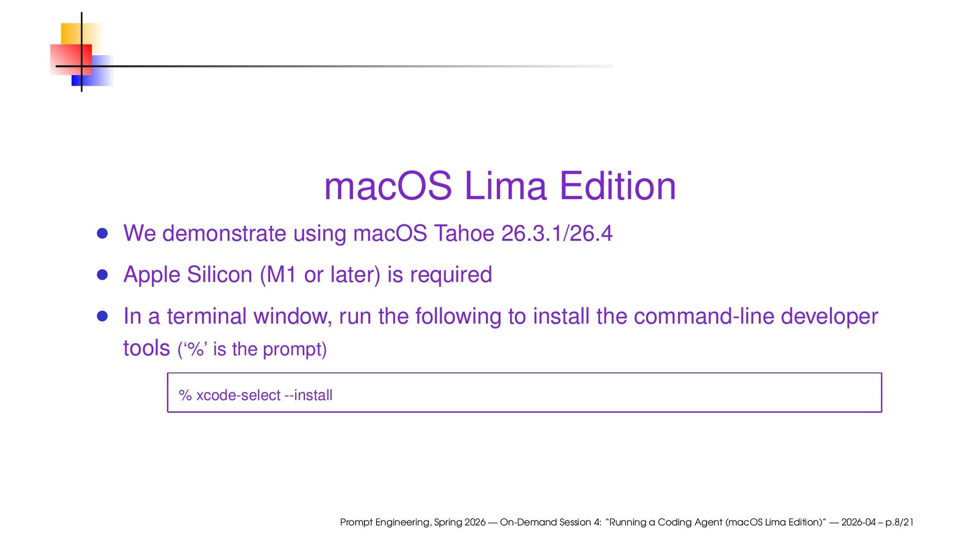 Silicon (M1 or later) is required In a terminal window, run the following to install the command-line developer tools (‘%’ is the prompt) % xcode-select --install Prompt Engineering, Spring 2026 — On-Demand Session 4: “Running a Coding Agent (macOS Lima Edition)” — 2026-04 – p.8/21