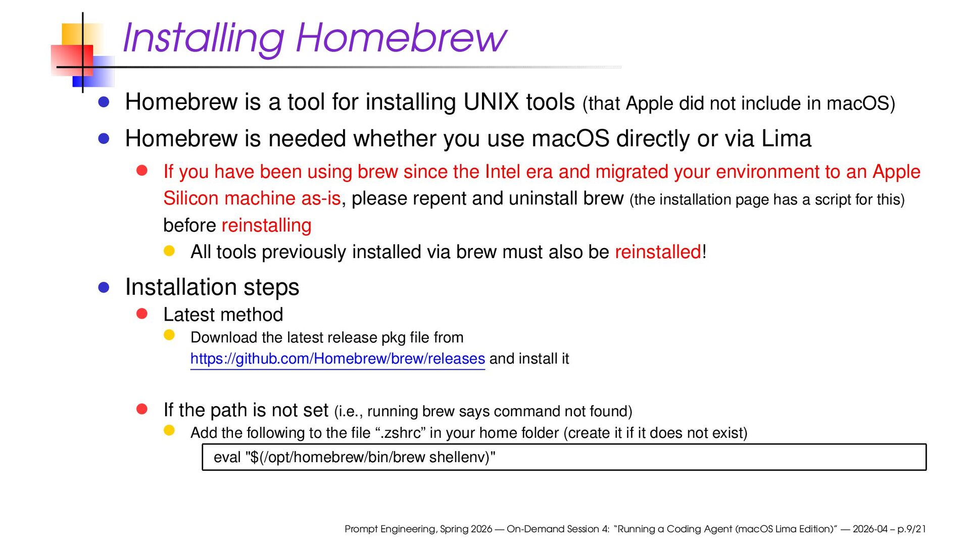(that Apple did not include in macOS) Homebrew is needed whether you use macOS directly or via Lima If you have been using brew since the Intel era and migrated your environment to an Apple Silicon machine as-is, please repent and uninstall brew (the installation page has a script for this) before reinstalling All tools previously installed via brew must also be reinstalled! Installation steps Latest method Download the latest release pkg file from https://github.com/Homebrew/brew/releases and install it If the path is not set (i.e., running brew says command not found) Add the following to the file “.zshrc” in your home folder (create it if it does not exist) eval "$(/opt/homebrew/bin/brew shellenv)" Prompt Engineering, Spring 2026 — On-Demand Session 4: “Running a Coding Agent (macOS Lima Edition)” — 2026-04 – p.9/21