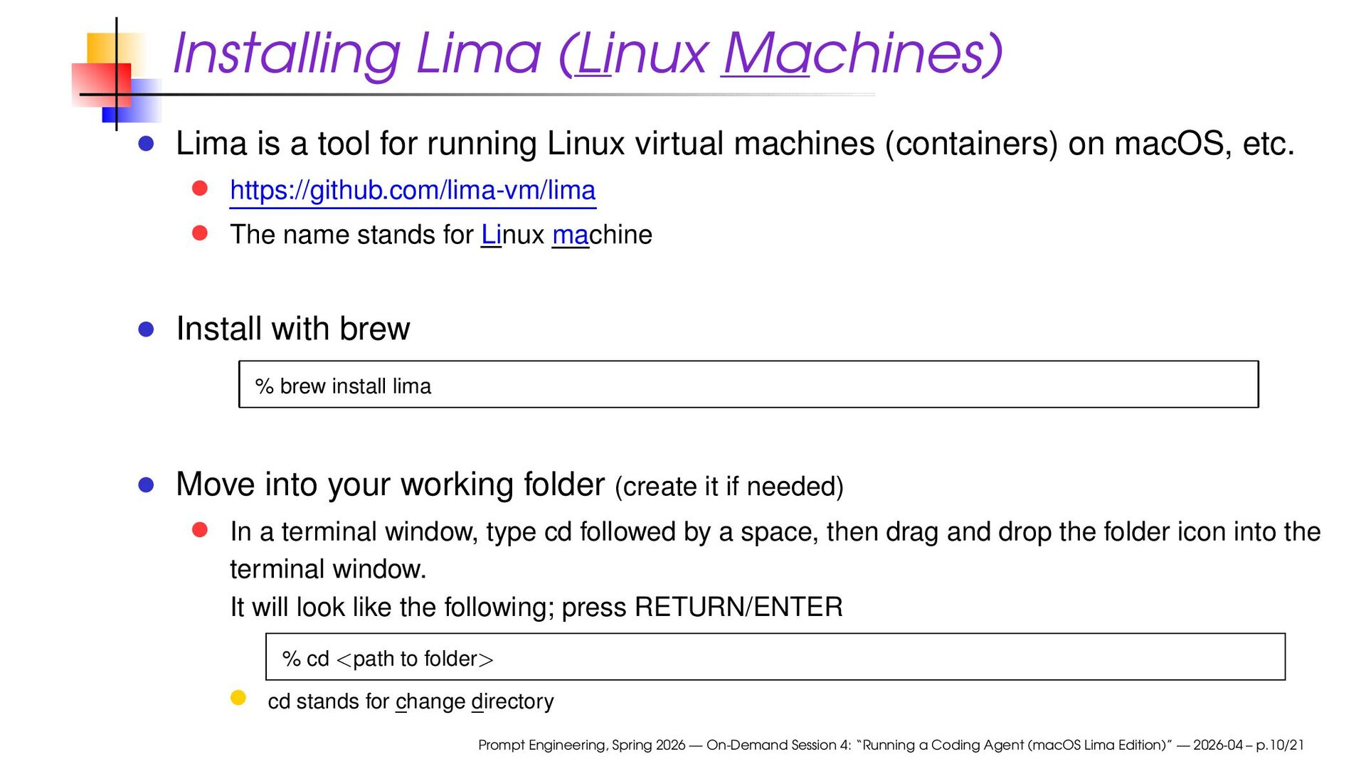 Linux virtual machines (containers) on macOS, etc. https://github.com/lima-vm/lima The name stands for Linux machine Install with brew % brew install lima Move into your working folder (create it if needed) In a terminal window, type cd followed by a space, then drag and drop the folder icon into the terminal window. It will look like the following; press RETURN/ENTER % cd <path to folder> cd stands for change directory Prompt Engineering, Spring 2026 — On-Demand Session 4: “Running a Coding Agent (macOS Lima Edition)” — 2026-04 – p.10/21