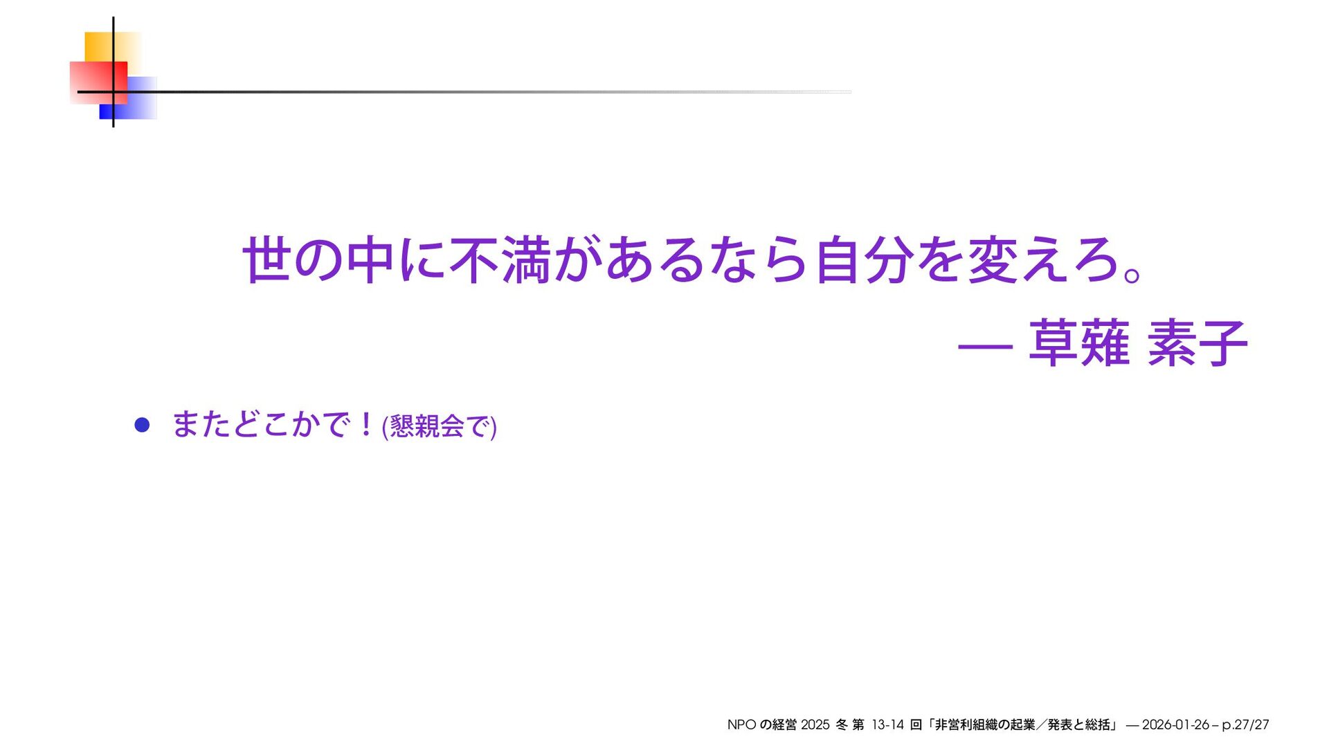 https://speakerdeck.com/ks91/collections/managing-the-npo-2025-winter NPO 2025 13-14 — 2026-01-26 – p.2/27