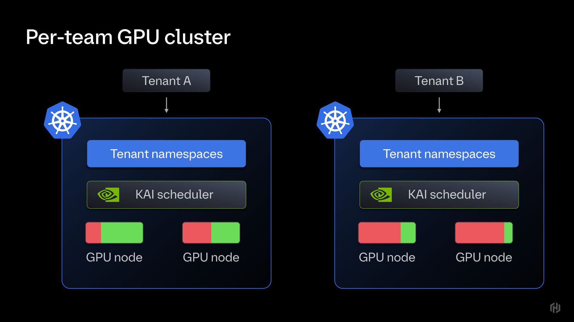 4. Per-team GPU cluster Tenant namespaces GPU node GPU node KAI