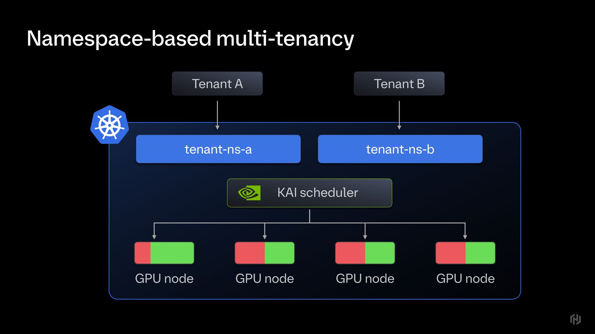 scheduler Tenant A Tenant namespaces GPU node GPU node KAI scheduler Tenant B