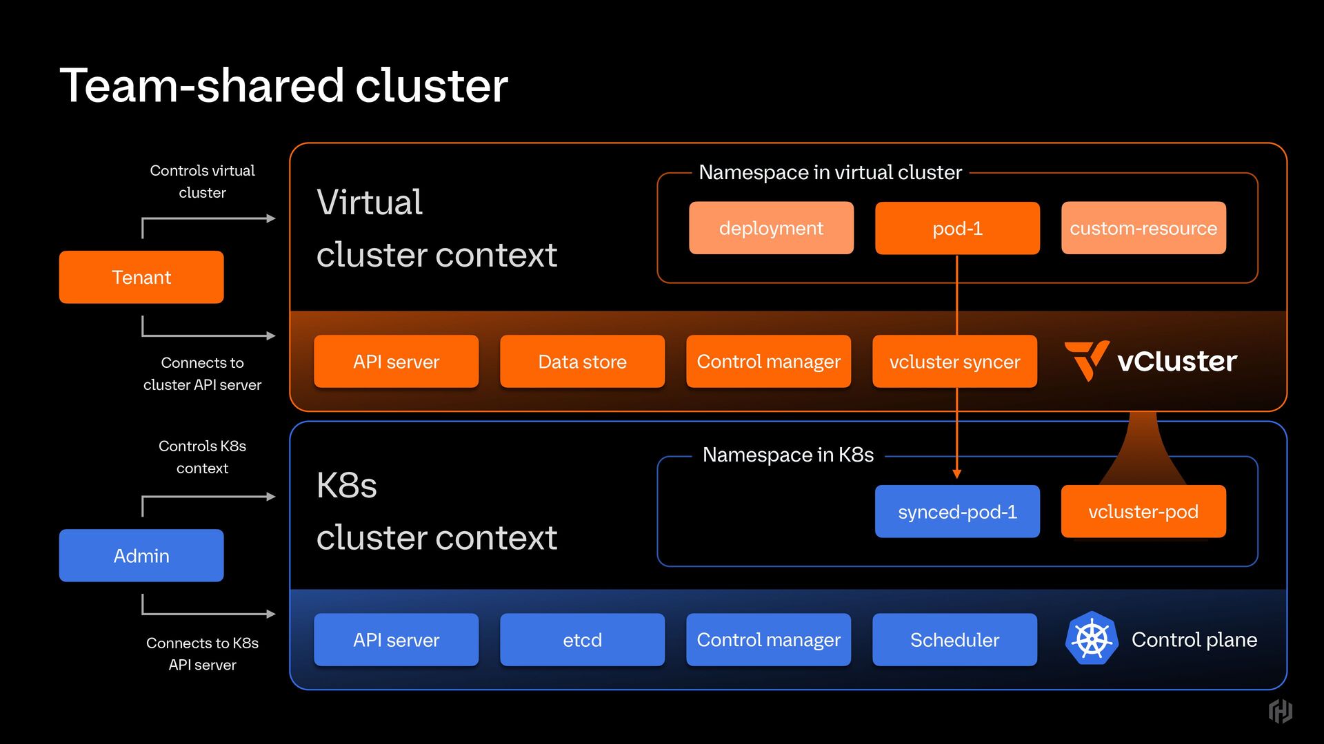 manager vcluster syncer API server Namespace in virtual cluster Virtual cluster context etcd Control manager Scheduler API server Control plane synced-pod-1 vcluster-pod Namespace in K8s K8s cluster context vcluster-pod Tenant Connects to cluster API server Controls virtual cluster Admin Connects to K8s API server Controls K8s context