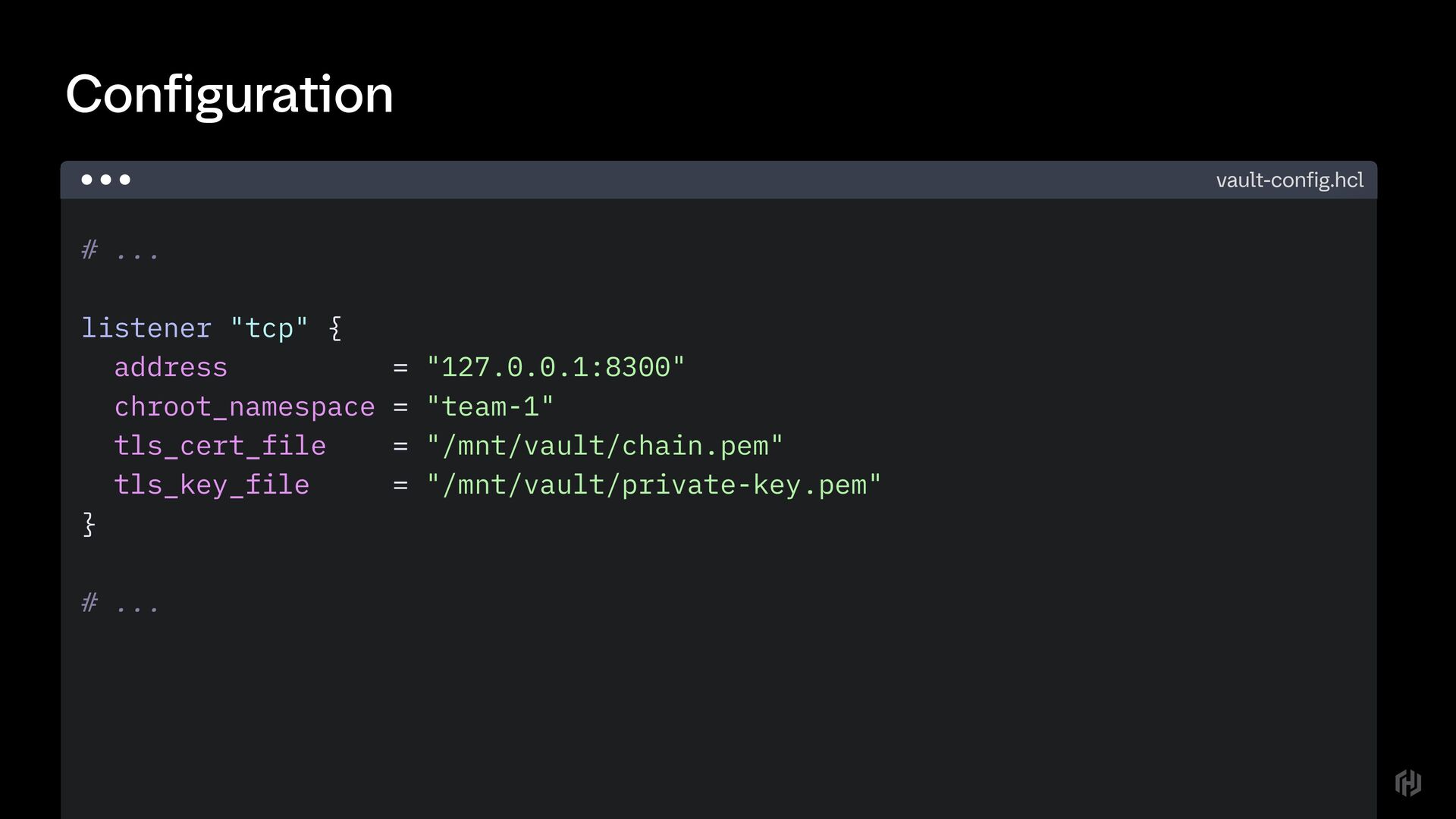 "team-1" tls_cert_file = "/mnt/vault/chain.pem" tls_key_file = "/mnt/vault/private-key.pem" } # ... Configuration vault-config.hcl