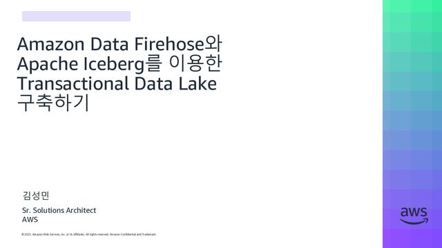 2025, Amazon Web Services, Inc. or its affiliates. All rights reserved. Amazon Confidential and Trademark. 김성민 Sr. Solutions Architect AWS Amazon Data Firehose와 Apache Iceberg를 이용한 Transactional Data Lake 구축하기