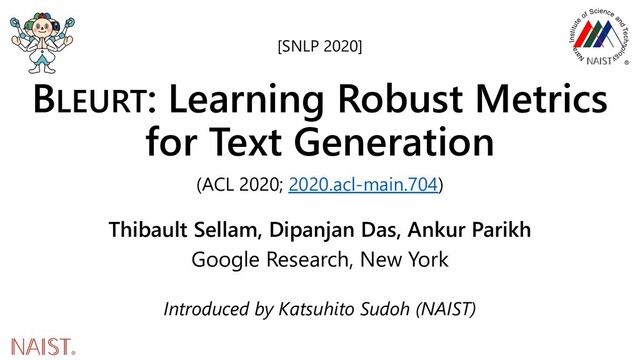 metric • Predicting a real-valued score for a given pair of hypothesis and the corresponding reference • Fine-tuned model based on BERT • Pre-training with different metrics & tasks • BLEU, ROUGE, BERTScore, BT likelihood, NLI, BT flag • Outperforms other metrics in WMT/WebNLG • Robust to small or no fine-tuning data conditions 2