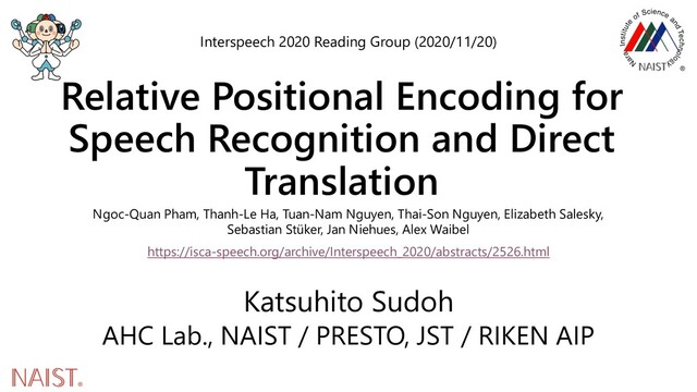 beyond a Fixed-Length Context, Proc. ACL (2019) • Gehring, J. et al., Convolutional Sequence to Sequence Learning, Proc. ICML (2017) • Huang, C.-Z. et al., Music Transformer: Generating Music with Long-Term Structure, Proc. ICLR (2019) • Park, D. S. et al., SpecAugment: A Simple Data Augmentation Method for Automatic Speech Recognition, Proc. Interspeech (2019) • Pham, N.-Q. et al., Very Deep Self-Attention Networks for End-to-End Speech Recognition, Proc. Interspeech (2019a) • Pham, N.-Q. et al, The IWSLT 2019 KIT Speech Translation System, Proc. IWSLT (2019b) • Shaw, P. et al., Self-Attention with Relative Position Representations, Proc. NAACL-HLT (2018) • Sukhbaatar, S. et al., End-To-End Memory Networks, Proc. NIPS (2015) • Takase, S. et al., Positional Encoding to Control Output Sequence Length, Proc. NAACL-HLT (2019) • Tom, K. et al., Audio Augmentation for Speech Recognition, Proc. Interspeech (2015) • Vaswani, A. et al., Attention Is All You Need, Proc. NIPS (2017) Interspeech 2020 Reading Group (2020/11/20) 17