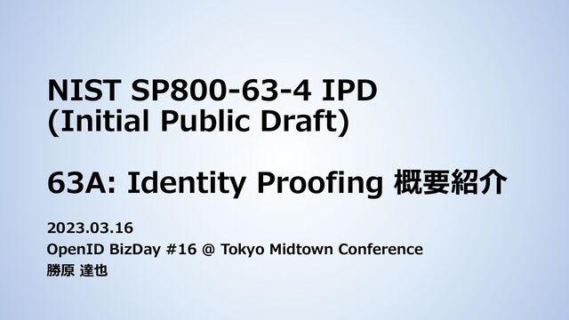 NIST SP800-63-4 Initial Public Draft(IPD) 63AのIdentity Proofingの概要について、説明を行った際の資料です。