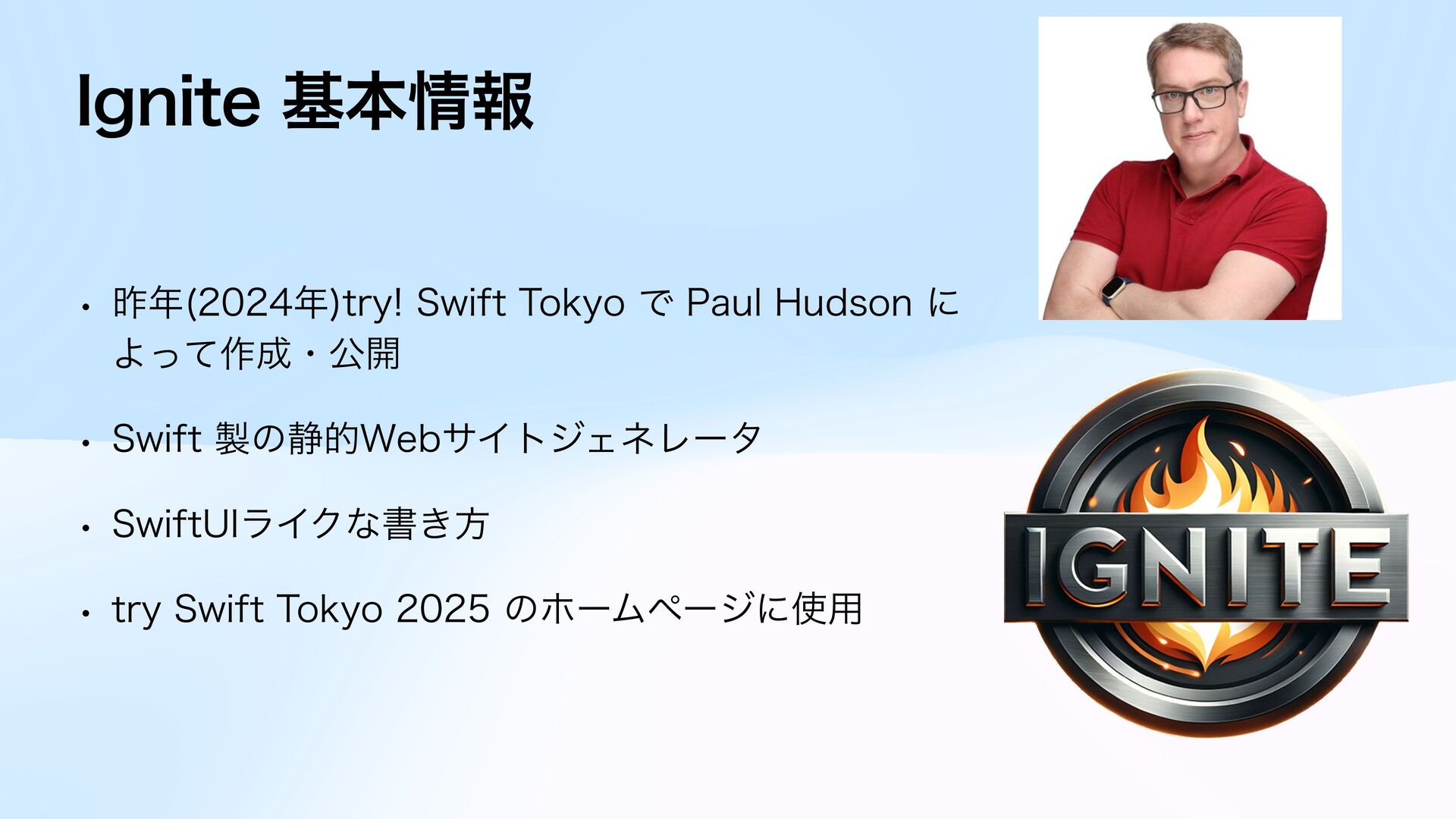2025年4月26日(土)に名古屋市政資料館で開催された Nagoya.swift の発表資料です。 Swift 製静的Webサイトジェネレータ "Ignite" の1年間の軌跡を10分のLTにまとめました。